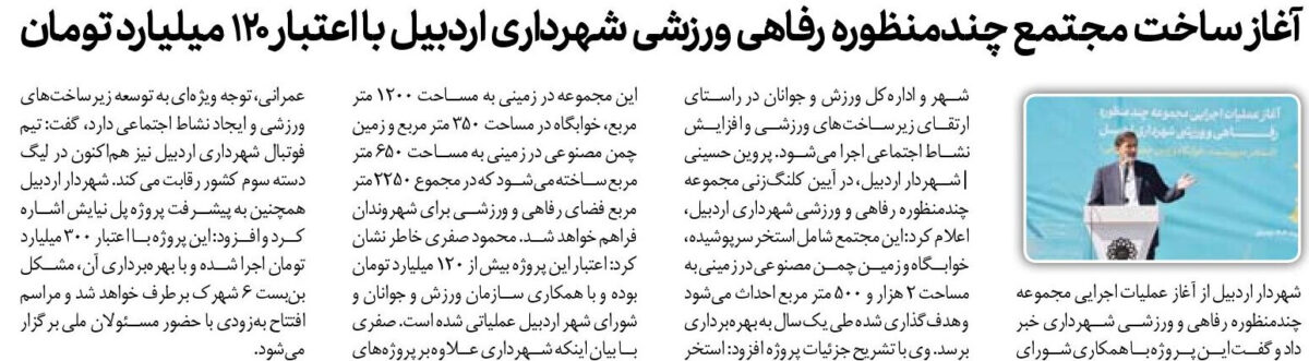 شهردار اردبیل از آغاز عملیات اجرایی مجموعه چندمنظوره رفاهی و ورزشی شهرداری خبر داد و گفت این پروژه با همکاری شورای شهر و اداره‌کل ورزش و جوانان در راستای ارتقای زیرساخت‌های ورزشی و افزایش نشاط اجتماعی اجرا می‌شود. پروین حسینی | شهردار اردبیل، در آیین کلنگ‌زنی مجموعه چندمنظوره رفاهی و ورزشی شهرداری اردبیل، اعلام کرد: این مجتمع شامل استخر سرپوشیده، خوابگاه و زمین چمن مصنوعی در زمینی به مساحت ۲ هزار و ۵۰۰ متر مربع احداث می‌شود و هدف‌گذاری شده طی یک سال به بهره‌برداری برسد. وی با تشریح جزئیات پروژه افزود: استخر این مجموعه در زمینی به مساحت ۱۲۰۰ متر مربع، خوابگاه در مساحت ۳۵۰ متر مربع و زمین چمن مصنوعی در زمینی به مساحت ۶۵۰ متر مربع ساخته می‌شود که در مجموع ۲۲۵۰ متر مربع فضای رفاهی و ورزشی برای شهروندان فراهم خواهد شد. محمود صفری خاطر نشان کرد: اعتبار این پروژه بیش از ۱۲۰ میلیارد تومان بوده و با همکاری سازمان ورزش و جوانان و شورای شهر اردبیل عملیاتی شده است. صفری با بیان اینکه شهرداری علاوه بر پروژه‌های عمرانی، توجه ویژه‌ای به توسعه زیرساخت‌های ورزشی و ایجاد نشاط اجتماعی دارد، گفت: تیم فوتبال شهرداری اردبیل نیز هم‌اکنون در لیگ دسته سوم کشور رقابت می‌کند. شهردار اردبیل همچنین به پیشرفت پروژه پل نیایش اشاره کرد و افزود: این پروژه با اعتبار ۳۰۰ میلیارد تومان اجرا شده و با بهره‌برداری آن، مشکل بن‌بست ۶ شهرک برطرف خواهد شد و مراسم افتتاح به‌زودی با حضور مسئولان ملی برگزار می‌شود.