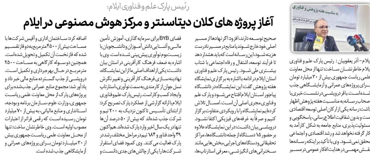 ایلام- آذر یعقوبیان : رئیس پارک علم و فناوری ایلام خاطرنشان ساخت: تنها از محل معاونت علمی ریاست جمهوری بیش از ۳۰ میلیارد تومان برای پروژههای عمرانی و آزمایشگاهی جذب شده است. باقر درویشی در نشست خبری با اصحاب رسانه به مناسبت هفته پژوهش اظهار داشت: رسانه یکی از ارکان اصلی توسعه اقتصادی است و بدون شفافیت اطلاعرسانی، پاسخگویی و مسئولیتپذیری، منابع جامعه به شکل کارآمد به کار گرفته نخواهد شد و رشد اقتصادی و اجتماعی محقق نمیشود. وی با تأکید بر اینکه رسانهها نقش مهمی در هدایت افکار عمومی در مسیر صحیح توسعه دارند، افزود: اگر نهادها از مسیر اصلی خود خارج شوند یا منابع در مسیر نادرست هزینه شود، این رسانه است که باید هشدار دهد تا فرآیند توسعه، اشتغال و رفاه اجتماعی با شتاب بیشتری طی شود. رئیس پارک علم و فناوری استان ایلام در ادامه با اشاره به برگزاری نمایشگاه هفته پژوهش گفت: این نمایشگاه در دانشگاه پیامنور استان ایلام افتتاح میشود و پارک علم و فناوری مجری اصلی آن است. امسال تلاش کردهایم نمایشگاه را با رویکردی متفاوت برگزار کنیم و صرفاً به غرفههای فیزیکی اکتفا نشود. درویشی بیان داشت: در این نمایشگاه علاوه بر حضور ۱۵ دستگاه از جمله دانشگاهها، مراکز تحقیقاتی و دستگاههای اجرایی، بخشهایی مانند سخنرانیهای انگیزشی، معرفی استارتاپها، فضای B2B برای سرمایهگذاری، آموزش تأمین مالی و آشنایی دانشآموزان و دانشجویان با زیستبوم نوآوری پیشبینی شده است. وی با اشاره به ضعف فرهنگ کارآفرینی در استان بیان داشت: یکی از اهداف اصلی ما از این نمایشگاه، نهادینهسازی فرهنگ کارآفرینی و تغییر نگرش نسل جوان از کارمندی به سمت نوآوری، استارتاپ و ایجاد کسبوکار است. رئیس پارک علم و فناوری ایلام با ارائه گزارشی از عملکرد پارک تصریح کرد: از ابتدای تأسیس تاکنون نزدیک به ۲۰۰ تیم و شرکت جذب شدهاند که بیش از ۵۰ درصد آنها تنها در یک سال اخیر وارد پارک شدهاند. هماکنون ۴۹ واحد فناور و ۱۸۴ تیم در مراحل مختلف رشد در پارک فعالیت میکنند. وی کمبود فضای استقرار شرکتها را یکی از چالشهای جدی دانست و اضافه کرد: ساختمان اداری و آفیس شرکتها با مساحت بیش از ۴۵۰۰ مترمربع به دو فاز تقسیم شده که فاز نخست آن تکمیل و تحویل شده است. همچنین دو سوله کارگاهی به مساحت ۲۵۰۰ مترمربع در حال بهرهبرداری و تکمیل است. درویشی از جذب گسترده منابع مالی خبر داد و یادآور شد: مجموع منابع عمرانی جذبشده برای پروژههای پارک از محل معاونت علمی ریاست جمهوری، وزارت علوم، سازمان برنامه و بودجه، استانداری و منابع مالیاتی، به بیش از ۷۰ میلیارد تومان رسیده است که رقمی فراتر از اعتبارات مصوب اولیه است. وی خاطرنشان ساخت: تنها از محل معاونت علمی ریاست جمهوری بیش از ۳۰ میلیارد تومان برای پروژههای عمرانی و آزمایشگاهی جذب شده است.