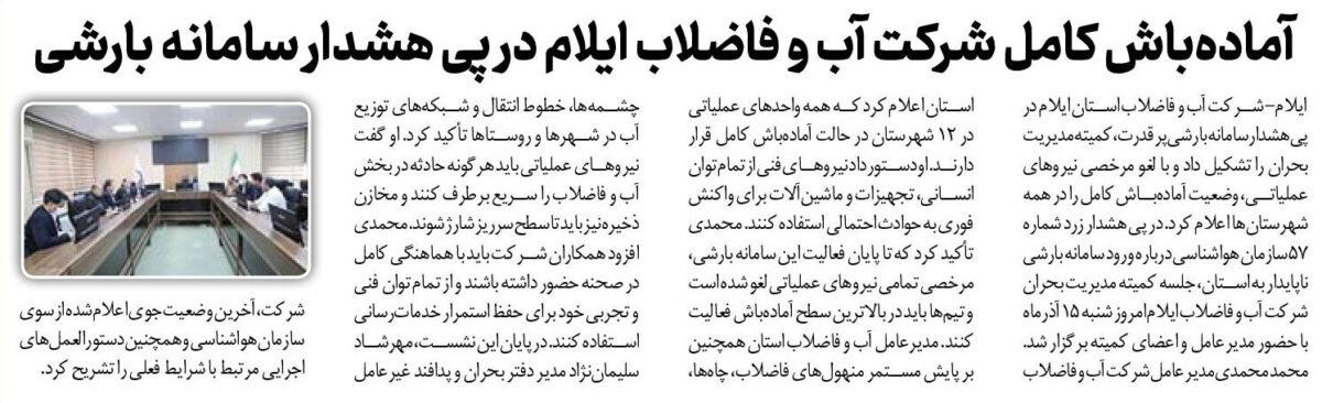 ایلام- شرکت آب و فاضلاب استان ایلام در پی هشدار سامانه بارشی پرقدرت، کمیته مدیریت بحران را تشکیل داد و با لغو مرخصی نیروهای عملیاتی، وضعیت آمادهباش کامل را در همه شهرستانها اعلام کرد. در پی هشدار زرد شماره ۵۷ سازمان هواشناسی درباره ورود سامانه بارشی ناپایدار به استان، جلسه کمیته مدیریت بحران شرکت آب و فاضلاب ایلام امروز شنبه ۱۵ آذرماه با حضور مدیرعامل و اعضای کمیته برگزار شد. محمد محمدی مدیرعامل شرکت آب و فاضلاب استان اعلام کرد که همه واحدهای عملیاتی در ۱۲ شهرستان در حالت آمادهباش کامل قرار دارند. او دستور داد نیروهای فنی از تمام توان انسانی، تجهیزات و ماشینآلات برای واکنش فوری به حوادث احتمالی استفاده کنند. محمدی تأکید کرد که تا پایان فعالیت این سامانه بارشی، مرخصی تمامی نیروهای عملیاتی لغو شده است و تیمها باید در بالاترین سطح آمادهباش فعالیت کنند. مدیرعامل آب و فاضلاب استان همچنین بر پایش مستمر منهولهای فاضلاب، چاهها، چشمهها، خطوط انتقال و شبکههای توزیع آب در شهرها و روستاها تأکید کرد. او گفت نیروهای عملیاتی باید هرگونه حادثه در بخش آب و فاضلاب را سریع برطرف کنند و مخازن ذخیره نیز باید تا سطح سرریز شارژ شوند. محمدی افزود همکاران شرکت باید با هماهنگی کامل در صحنه حضور داشته باشند و از تمام توان فنی و تجربی خود برای حفظ استمرار خدماترسانی استفاده کنند. در پایان این نشست، مهرشاد سلیماننژاد مدیر دفتر بحران و پدافند غیرعامل شرکت، آخرین وضعیت جوی اعلامشده از سوی سازمان هواشناسی و همچنین دستورالعملهای اجرایی مرتبط با شرایط فعلی را تشریح کرد.
