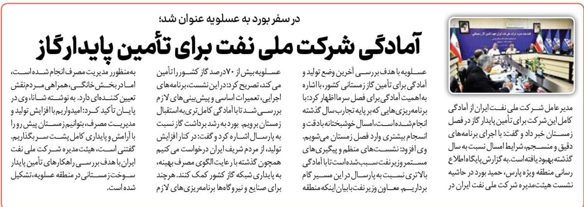 مدیرعامل شرکت ملی نفت ایران از آمادگی کامل این شرکت برای تأمین پایدار گاز در فصل زمستان خبر داد و گفت: با اجرای برنامه‌های دقیق و منسجم، شرایط امسال نسبت به سال گذشته بهبود یافته است. به گزارش پایگاه اطلاع رسانی منطقه ویژه پارس، حمید بورد در حاشیه نشست هیئت‌مدیره شرکت ملی نفت ایران در عسلویه با هدف بررسی آخرین وضع تولید و آمادگی برای تأمین گاز زمستانی کشور، با اشاره به اهمیت آمادگی برای فصل سرما اظهار کرد: با برنامه‌ریزی‌هایی که بر پایه تجارب سال گذشته انجام شده است، امسال خوشبختانه با دقت و انسجام بیشتری وارد فصل زمستان می‌شویم. وی افزود: نشست‌های منظم و پیگیری‌های مستمر وزیر نفت سبب شده است تا با آمادگی بالاتری نسبت به پارسال در این مسیر گام برداریم. معاون وزیر نفت با بیان اینکه منطقه عسلویه بیش از ۷۰ درصد گاز کشور را تأمین می‌کند، تصریح کرد: در این نشست، برنامه‌های اجرایی، تعمیرات اساسی و پیش‌بینی‌های لازم بررسی شد تا با آمادگی کامل‌تری به استقبال زمستان برویم. بورد به رشد برداشت گاز نسبت به پارسال اشاره کرد و گفت: در کنار افزایش تولید، از مردم شریف ایران درخواست می‌کنیم همچون گذشته با رعایت الگوی مصرف بهینه، به پایداری شبکه گاز کشور کمک کنند. هرچند برای صنایع و نیروگاه‌ها برنامه‌ریزی‌های لازم به‌منظورر مدیریت مصرف انجام شده است، اما در بخش خانگی، همراهی مردم نقش تعیین‌کننده‌ای دارد. به نوشته شانا، وی در پایان تأکید کرد: امیدواریم با افزایش تولید و مدیریت مصرف، بتوانیم زمستان پیش‌ رو را با آرامش و پایداری کامل پشت سر بگذاریم. گفتنی است، هیئت‌مدیره شرکت ملی نفت ایران با هدف بررسی راهکارهای تأمین پایدار سوخت زمستانی در منطقه عسلویه، تشکیل شده است.