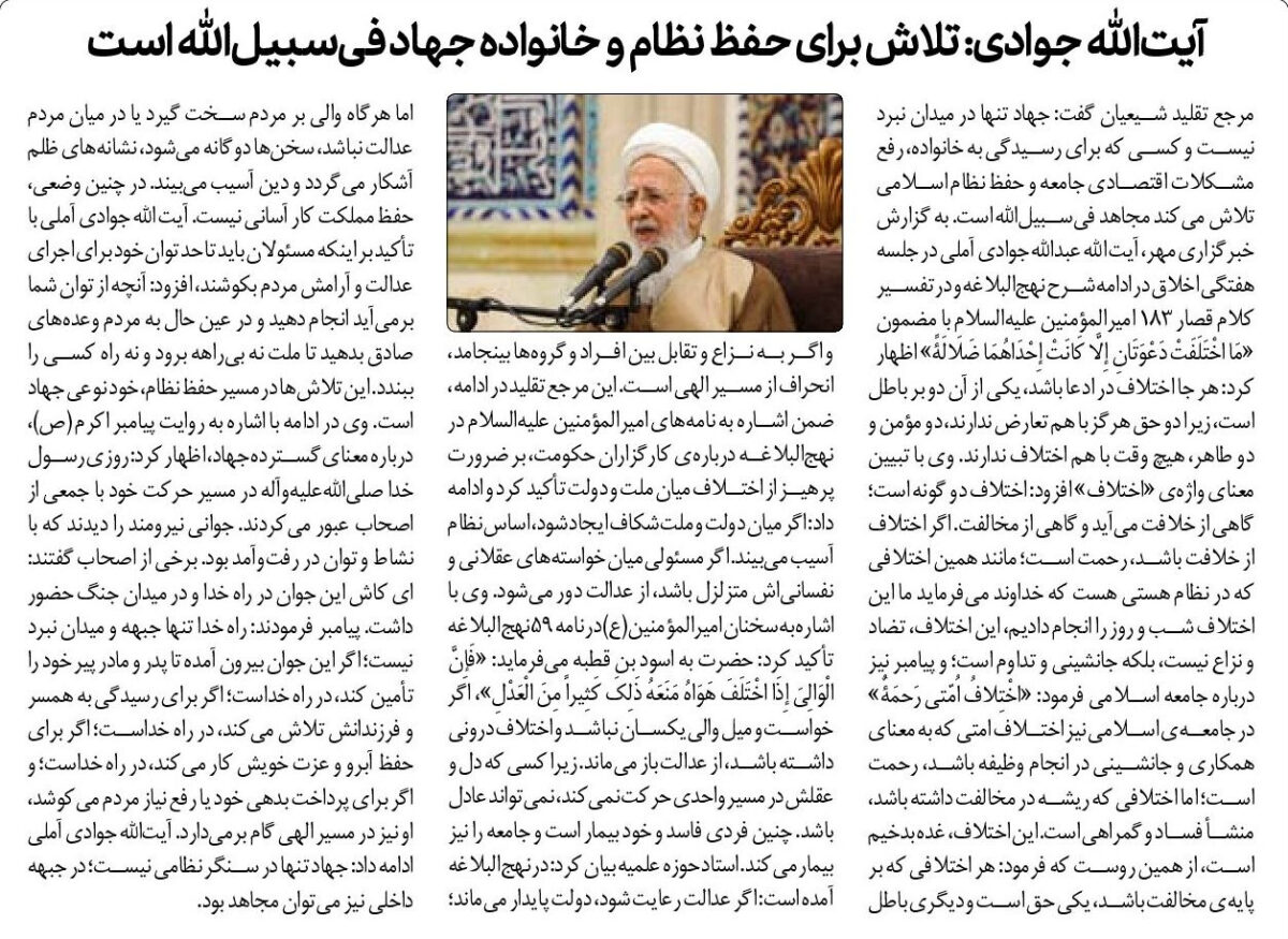 مرجع تقلید شیعیان گفت: جهاد تنها در میدان نبرد نیست و کسی که برای رسیدگی به خانواده، رفع مشکلات اقتصادی جامعه و حفظ نظام اسلامی تلاش میکند مجاهد فیسبیلالله است. به گزارش خبرگزاری مهر، آیت الله عبدالله جوادی آملی در جلسه هفتگی اخلاق در ادامه شرح نهجالبلاغه و در تفسیر کلام قصار ۱۸۳ امیرالمؤمنین علیهالسلام با مضمون «مَا اخْتَلَفَتْ دَعْوَتَانِ إِلَّا کَانَتْ إِحْدَاهُمَا ضَلَالَةً» اظهار کرد: هر جا اختلاف در ادعا باشد، یکی از آن دو بر باطل است، زیرا دو حق هرگز با هم تعارض ندارند، دو مؤمن و دو طاهر، هیچ وقت با هم اختلاف ندارند. وی با تبیین معنای واژهی «اختلاف» افزود: اختلاف دو گونه است؛ گاهی از خلافت میآید و گاهی از مخالفت. اگر اختلاف از خلافت باشد، رحمت است؛ مانند همین اختلافی که در نظام هستی هست که خداوند میفرماید ما این اختلاف شب و روز را انجام دادیم، این اختلاف، تضاد و نزاع نیست، بلکه جانشینی و تداوم است؛ و پیامبر نیز درباره جامعه اسلامی فرمود: «اخْتِلافُ اُمّتی رَحمَةٌ» در جامعهی اسلامی نیز اختلاف امتی که به معنای همکاری و جانشینی در انجام وظیفه باشد، رحمت است؛ اما اختلافی که ریشه در مخالفت داشته باشد، منشأ فساد و گمراهی است. این اختلاف، غده بدخیم است، از همین روست که فرمود: هر اختلافی که بر پایهی مخالفت باشد، یکی حق است و دیگری باطل و اگر به نزاع و تقابل بین افراد و گروهها بینجامد، انحراف از مسیر الهی است. این مرجع تقلید در ادامه، ضمن اشاره به نامههای امیرالمؤمنین علیهالسلام در نهجالبلاغه دربارهی کارگزاران حکومت، بر ضرورت پرهیز از اختلاف میان ملت و دولت تأکید کرد و ادامه داد: اگر میان دولت و ملت شکاف ایجاد شود، اساس نظام آسیب میبیند. اگر مسئولی میان خواستههای عقلانی و نفسانیاش متزلزل باشد، از عدالت دور میشود. وی با اشاره به سخنان امیرالمؤمنین (ع) در نامه ۵۹ نهجالبلاغه تأکید کرد: حضرت به اسود بن قطبه میفرماید: «فَإِنَّ الْوَالِیَ إِذَا اخْتَلَفَ هَوَاهُ مَنَعَهُ ذَلِکَ کَثِیراً مِنَ الْعَدْلِ»، اگر خواست و میل والی یکسان نباشد و اختلاف درونی داشته باشد، از عدالت باز میماند. زیرا کسی که دل و عقلش در مسیر واحدی حرکت نمیکند، نمیتواند عادل باشد. چنین فردی فاسد و خود بیمار است و جامعه را نیز بیمار میکند. استاد حوزه علمیه بیان کرد: در نهجالبلاغه آمده است: اگر عدالت رعایت شود، دولت پایدار میماند؛ اما هرگاه والی بر مردم سخت گیرد یا در میان مردم عدالت نباشد، سخنها دوگانه میشود، نشانههای ظلم آشکار میگردد و دین آسیب میبیند. در چنین وضعی، حفظ مملکت کار آسانی نیست. آیت الله جوادی آملی با تأکید بر اینکه مسئولان باید تا حد توان خود برای اجرای عدالت و آرامش مردم بکوشند، افزود: آنچه از توان شما برمیآید انجام دهید و در عین حال به مردم وعدههای صادق بدهید تا ملت نه بیراهه برود و نه راه کسی را ببندد. این تلاشها در مسیر حفظ نظام، خود نوعی جهاد است. وی در ادامه با اشاره به روایت پیامبر اکرم (ص)، درباره معنای گسترده جهاد، اظهار کرد: روزی رسول خدا صلیاللهعلیهوآله در مسیر حرکت خود با جمعی از اصحاب عبور میکردند. جوانی نیرومند را دیدند که با نشاط و توان در رفتوآمد بود. برخی از اصحاب گفتند: ای کاش این جوان در راه خدا و در میدان جنگ حضور داشت. پیامبر فرمودند: راه خدا تنها جبهه و میدان نبرد نیست؛ اگر این جوان بیرون آمده تا پدر و مادر پیر خود را تأمین کند، در راه خداست؛ اگر برای رسیدگی به همسر و فرزندانش تلاش میکند، در راه خداست؛ اگر برای حفظ آبرو و عزت خویش کار میکند، در راه خداست؛ و اگر برای پرداخت بدهی خود یا رفع نیاز مردم میکوشد، او نیز در مسیر الهی گام برمیدارد. آیتالله جوادی آملی ادامه داد: جهاد تنها در سنگر نظامی نیست؛ در جبهه داخلی نیز میتوان مجاهد بود.