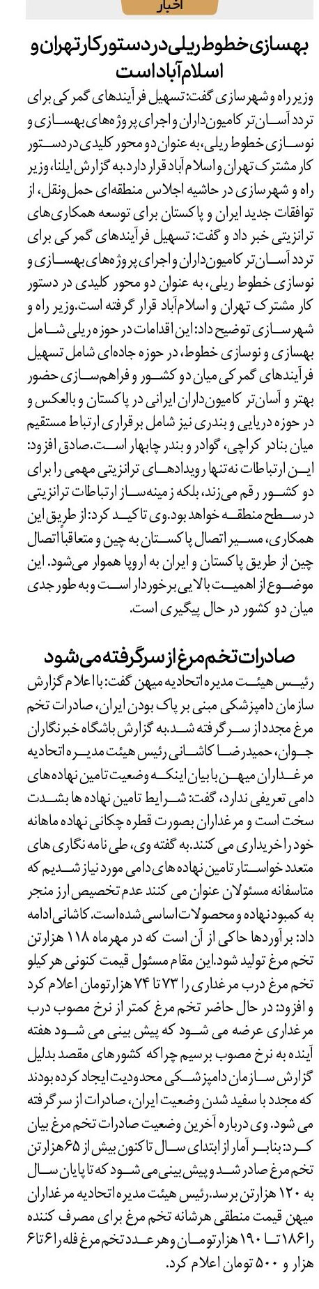 وزیر راه و شهرسازی گفت: تسهیل فرآیندهای گمرکی برای تردد آسان‌تر کامیون‌داران و اجرای پروژه‌های بهسازی و نوسازی خطوط ریلی، به عنوان دو محور کلیدی دردستور کار مشترک تهران و اسلام‌آباد قرار دارد.به گزارش ایلنا، وزیر راه و شهرسازی در حاشیه اجلاس منطقه‌ای حمل‌ونقل، از توافقات جدید ایران و پاکستان برای توسعه همکاری‌های ترانزیتی خبر داد و گفت: تسهیل فرآیندهای گمرکی برای تردد آسان‌تر کامیون‌داران و اجرای پروژه‌های بهسازی و نوسازی خطوط ریلی، به عنوان دو محور کلیدی در دستور کار مشترک تهران و اسلام‌آباد قرار گرفته است.وزیر راه و شهرسازی توضیح داد: این اقدامات در حوزه ریلی شامل بهسازی و نوسازی خطوط، در حوزه جاده‌ای شامل تسهیل فرآیندهای گمرکی میان دو کشور و فراهم‌سازی حضور بهتر و آسان‌تر کامیون‌داران ایرانی در پاکستان و بالعکس و در حوزه دریایی و بندری نیز شامل برقراری ارتباط مستقیم میان بنادر کراچی، گوادر و بندر چابهار است.صادق افزود: این ارتباطات نه‌تنها رویدادهای ترانزیتی مهمی را برای دو کشور رقم می‌زند، بلکه زمینه‌ساز ارتباطات ترانزیتی در سطح منطقه خواهد بود.وی تاکید کرد: از طریق این همکاری، مسیر اتصال پاکستان به چین و متعاقباً اتصال چین از طریق پاکستان و ایران به اروپا هموار می‌شود. این موضوع از اهمیت بالایی برخوردار است و به طور جدی میان دو کشور در حال پیگیری است.