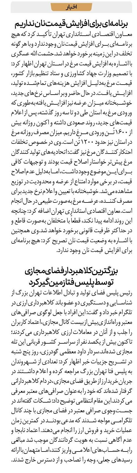 معاون اقتصادی استانداری تهران تأکید کرد که هیچ برنامهای برای افزایش قیمت نان وجود ندارد و با هرگونه تخلف در این زمینه برخورد خواهد شد.حشمت الله عسگری با اشاره به افزایش قیمت مرغ در استان تهران اظهار کرد: با تصمیم وزارت جهاد کشاورزی و ستاد تنظیم بازار کشور، قیمت مرغ بهدلیل افزایش هزینههای تمامشده تولید، افزایش یافت. در حال حاضر و بر اساس نرخهای جدید، خوشبختانه میزان عرضه نیز افزایش یافته بهطوریکه ورودی مرغ به استان طی دو تا سه روز گذشته، پس از اعلام قیمتهای جدید، روند صعودی داشته و اکنون روزانه بیش از ۱۶۰۰ تُن ورودی مرغ داریم. میزان مصرف روزانه مرغ در استان نیز حدود ۱۲۰۰ تُن است.وی در خصوص تخلفات احتکارکنندگان مرغ نیز گفت: اتحادیههای تولیدکنندگان مرغ پیشتر خواستار اصلاح قیمت بودند و توجیهات کافی برای این موضوع وجود داشت، اما بهدلیل عدم اصلاح قیمت، در برخی موارد امتناع از عرضه و محدودیت در توزیع مشاهده میشد. خوشبختانه با تعیین و اعلام نرخ جدید برای مصرفکننده، عرضه مرغ بهصورت طبیعی در حال انجام است.معاون اقتصادی استانداری تهران اضافه کرد: چنانچه این روند ادامه پیدا نکند، قطعاً با متخلفان بهصورت قاطع و در حداکثر ظرفیت قانونی برخورد خواهد شد.وی همچنین با اشاره به وضعیت قیمت نان تصریح کرد: هیچ برنامهای برای افزایش قیمت نان وجود ندارد.