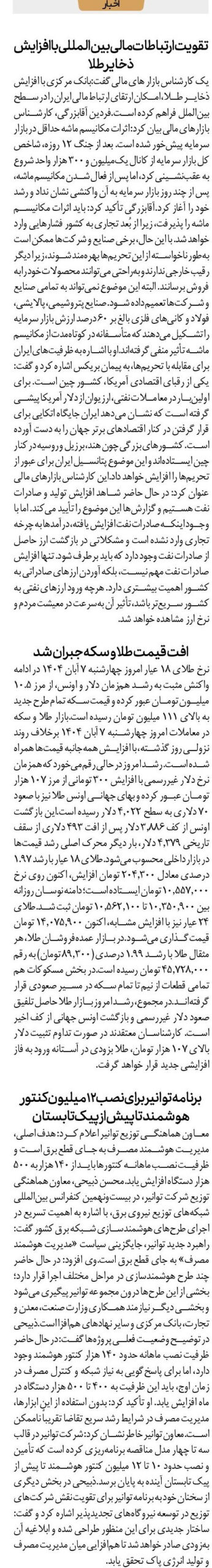 یک کارشناس بازار های مالی گفت:بانک مرکزی با افزایش ذخایر طلا، امکان ارتقای ارتباط مالی ایران را در سطح بینالملل فراهم کرده است.فردین آقابزرگی، کارشناس بازارهای مالی بیان کرد: اثرات مکانیسم ماشه حداقل در بازار سرمایه پیشخور شده است. بعد از جنگ ۱۲ روزه، شاخص کل بازار سرمایه از کانال یکمیلیون و ۳۰۰ هزار واحد شروع به عقبنشینی کرد، اما پس از فعال شدن مکانیسم ماشه، پس از چند روز بازار سرمایه به آن واکنشی نشان نداد و رشد خود را آغاز کرد.آقابزرگی تأکید کرد: باید اثرات مکانیسم ماشه را پذیرفت، زیرا از بُعد تجاری به کشور فشارهایی وارد خواهد شد. با این حال، برخی صنایع و شرکتها ممکن است بهطور ناخواسته از این تحریمها بهرهمند شوند، زیرا دیگر رقیب خارجی ندارند و بهراحتی میتوانند محصولات خود را به فروش برسانند. البته این موضوع نمیتواند به تمامی صنایع و شرکتها تعمیم داده شود. صنایع پتروشیمی، پالایشی، فولاد و کانیهای فلزی بالغ بر ۶۰ درصد ارزش بازار سرمایه را تشکیل میدهند که متأسفانه در کوتاهمدت از مکانیسم ماشه تأثیر منفی گرفتهاند.او با اشاره به ظرفیتهای ایران برای مقابله با تحریمها، به پیمان بریکس اشاره کرد و گفت: یکی از رقبای اقتصادی آمریکا، کشور چین است. برای اولینبار در معاملات نفتی، ارز یوان از دلار آمریکا پیشی گرفته است که نشان میدهد ایران جایگاه اتکایی برای قرار گرفتن در کنار اقتصادهای برتر جهان را به دست آورده است. کشورهای بزرگی چون هند، برزیل و روسیه در کنار چین ایستادهاند و این موضوع پتانسیل ایران برای عبور از تحریمها را افزایش خواهد داد.این کارشناس بازارهای مالی عنوان کرد: در حال حاضر شاهد افزایش تولید و صادرات نفت هستیم و گزارشها این موضوع را تأیید میکند. اما با وجود اینکه صادرات نفت افزایش یافته، درآمدها به چرخه تجاری وارد نشده است و مشکلاتی در بازگشت ارز حاصل از صادرات نفت وجود دارد که باید برطرف شود. تنها افزایش صادرات نفت مهم نیست، بلکه آوردن ارزهای صادراتی به کشور اهمیت بیشتری دارد. هرچه ورود ارزهای نفتی به کشور سریعتر باشد، تأثیر آن بهسرعت در معیشت مردم و نرخ ارز مشاهده خواهد شد.