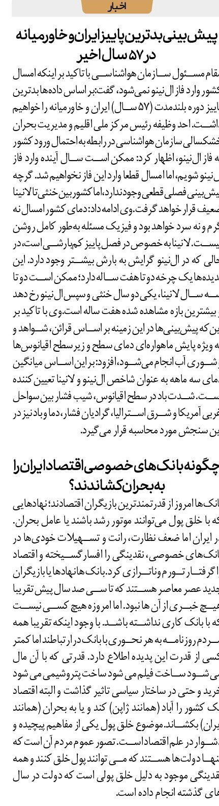 بانکها امروز از قدرتمندترین بازیگران اقتصادند؛ نهادهایی که با خلق پول میتوانند موتور رشد باشند یا عامل بحران. در ایران اما ضعف نظارت، رانت و تسهیلات خودیها در بانکهای خصوصی، نقدینگی را افسارگسیخته و اقتصاد را گرفتار تورم و ناترازی کرد. بانک ها نهادها یا بازیگران جدید عصر معاصر هستند که تا سی صد سال پیش تقریبا هیچ خبری از آن ها نبود. اما امروزه هیچ کسی نیست که با بانک کاری نداشته باشد. با وجود اینکه تقریبا همه مردم روزنامه به هر نحوری با بانک در ارتباطند اما کمتر کسی از قدرت این پدیده اطلاع دارد. قدرتی که با آن مال می شود ساخت فیلم می شود ساخت پتروشیمی می شود خرید و حتی در ساختار سیاسی تاثیر گذاشت و البته اقتصاد یک کشور را آباد (همانند ژاپن) کند و یا به بحران (همانند ایران) بکشاند.موضوع خلق پول یکی از مفاهیم پیچیده و دشوار در علم اقتصاد است. تصور عموم مردم آن است که تنها دولتها هستند که می توانند پول خلق کنند و همه نقدینگی موجود به دلیل خلق پولی است که دولت در سال های گذشته انجام داده است.