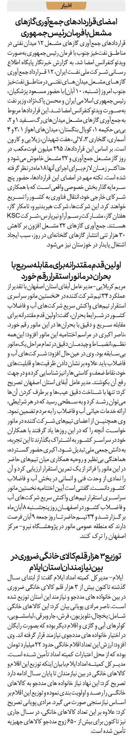 قراردادهای جمعآوری گازهای مشعل ۱۲ میدان نفتی در مناطق نفتخیز جنوب با فرمان رئیسجمهوری بهصورت ویدئوکنفرانس امضا شد. به گزارش خبرنگار پایگاه اطلاع رسانی شرکت ملی نفت ایران، ۱۲ قرارداد جمعآوری گازهای مشعل میدانهای نفتی در مناطق نفتخیز جنوب امروز (شنبه، ۱۰ آبان) با حضور مسعود پزشکیان، رئیسجمهوری اسلامی ایران و محسن پاکنژاد، وزیر نفت بهصورت ویدئوکنفرانس امضا شد. این قراردادها مربوط به جمعآوری گازهای مشعل میدانهای رگ سفید ۱ و ۲، بیبی حکیمه ۱، کوپال بنگستان، میدانهای اهواز ۱ ،۳ و ۴ آسماری، گلخاری ۳، لالی، هفت شهیدان، زیلایی و کارون است. بر اساس این قراردادها، ۲۹۵ میلیون فوتمکعب در روز گاز مشعل جمعآوری و ۳۲ مشعل خاموش میشود و حداکثر زمان لازم برای اجرای آنها ۱۸ ماه در نظر گرفته شده است. نکته مهم در امضای این قراردادها، حضور پنج سرمایهگذار بخش خصوصی واقعی است که با همکاری شرکای خارجی خود، انتقال فناوری به کشور را تسریع خواهند کرد. این شرکتها، شرکت هیربدنیرو، تامکار گاز، هفتان گاز، مشارکت رسم آرا و نیرپارس، شرکت KSC هستند. جمعآوری گازهای ۳۲ مشعل افزون بر کاهش ۳۰ هزار تنی انتشار گازهای گلخانهای در روز، سبب ایجاد اشتغال پایدار در خوزستان نیز میشود.