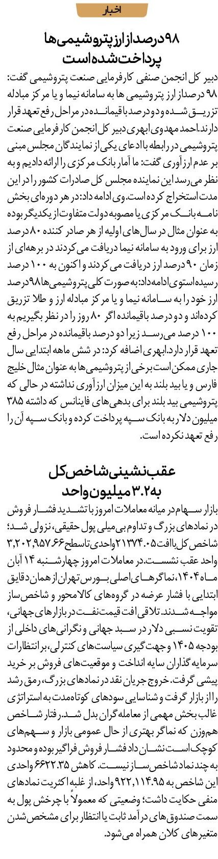 دبیر کل انجمن صنفی کارفرمایی صنعت پتروشیمی گفت: ۹۸ درصداز ارز پتروشیمی ها به سامانه نیما و یا مرکز مبادله تزریق شده و دو درصد باقیمانده در مراحل رفع تعهد قرار دارند.احمد مهدوی ابهری دبیر کل انجمن کارفرمایی صنعت پتروشیمی در رابطه با ادعای یکی از نمایندگان مجلس مبنی بر عدم ارزآوری گفت: ما آمار بانک مرکزی را ارائه دادیم و به نظر می‌رسد این نماینده مجلس کل صادرات کشور را در این مدت استخراج کرده است.وی ادامه داد: در هر دوره‌ای بخش نامه بانک مرکزی یا مصوبه دولت متفاوت از یکدیگر بوده به عنوان مثال در سال‌های اولیه از هر صادر کننده ۸۰ درصد ارز برای ورود به سامانه نیما دریافت می‌کردند در برهه‌ای از زمان ۹۰ درصد ارز دریافت می‌کردند و اکنون به ۱۰۰ درصد رسیده استوی ادامه داد: به صورت کلی پتروشیمی‌ها ۹۸ درصد ارز خود را به سامانه نیما و یا مرکز مبادله ارز و طلا تزریق کرده‌اند و دو درصد باقیمانده اگر ۸۰ روز را در نظر بگیریم به ۱۰۰ درصد می‌رسد زیرا دو درصد باقیمانده در مراحل رفع تعهد قرار دارد.ابهری اضافه کرد: در شش ماهه ابتدایی سال جاری ممکن است برخی از پتروشیمی‌ها به عنوان مثال خلیج فارس و یا بید بلند به این میزان ارزآوری نداشته در حالی که پتروشیمی بید بلند برای بدهی‌های فاینانس که داشته ۳۸۵ میلیون دلار به بانک سپه پرداخت کرده و بانک سپه آن را رفع تعهد نکرده است.