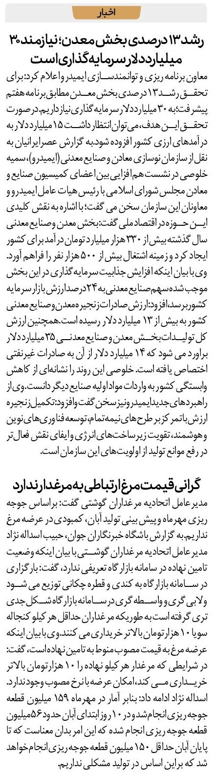 معاون برنامه ریزی و توانمندسازی ایمیدرو اعلام کرد: برای تحقق رشد ۱۳ درصدی بخش معدن مطابق برنامه هفتم پیشرفت؛ به ۳۰ میلیارد دلار سرمایهگذاری نیاز داریم. در صورت تحقق این هدف، میتوان انتظار داشت ۱۵ میلیارد دلار به درآمدهای ارزی کشور افزوده شود.به گزارش عصرایرانیان به نقل از سازمان نوسازی معادن و صنایع معدنی (ایمیدرو)، سمیه خلوصی در نشست هم افزایی بین اعضای کمیسیون صنایع و معادن مجلس شورای اسلامی با رئیس هیات عامل ایمیدرو و معاونان این سازمان سخن می گفت؛ با اشاره به نقش کلیدی این حوزه در اقتصاد ملی گفت: بخش معدن و صنایع معدنی سال گذشته بیش از ۳۳۰ هزار میلیارد تومان درآمد برای کشور ایجاد کرد و زمینه اشتغال بیش از ۵۰۰ هزار نفر را فراهم آورد. وی با بیان اینکه افزایش جذابیت سرمایهگذاری در این بخش موجب شده سهم صنایع معدنی به ۲۴ درصد ارزش بازار سرمایه کشور برسد، افزود: ارزش صادرات زنجیره معدن و صنایع معدنی کشور به بیش از ۱۳ میلیارد دلار رسیده است.همچنین ارزش کل تولیدات بخش معدن و صنایع معدنی ۳۵ میلیارد دلار براورد می شود که ۱۴ میلیارد دلار از آن به صادرات غیرنفتی اختصاص یافته است. خلوصی این روند را نشانهای از کاهش وابستگی کشور به واردات مواد اولیه صنایع دیگر دانست.وی از راهبردهای جدید ایمیدرو نیز سخن گفت و افزود: تکمیل زنجیره ارزش با تمرکز بر طرحهای نیمهتمام، توسعه فناوریهای نوین و هوشمند، تقویت زیرساختهای انرژی و ایفای نقش فعالتر در رفع موانع تولید از اولویتهای این سازمان است.
