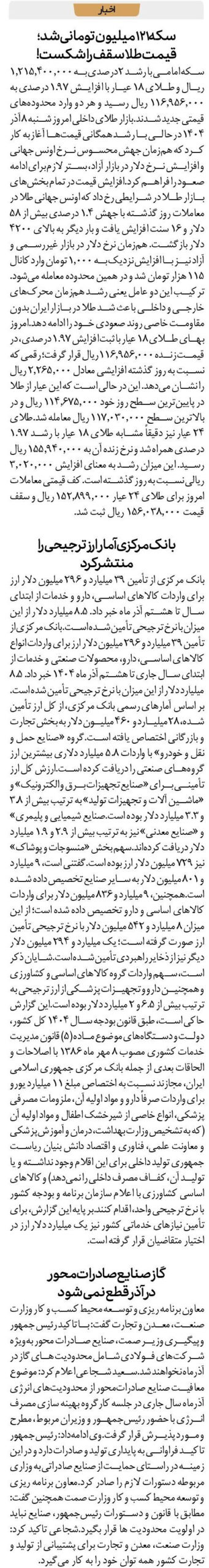 بانک مرکزی از تأمین ۳۹ میلیارد و ۲۹۶ میلیون دلار ارز برای واردات کالاهای اساسی، دارو و خدمات از ابتدای سال تا هشتم آذر ماه خبر داد. ۸.۵ میلیارد دلار از این میزان با نرخ ترجیحی تأمین شده است.بانک مرکزی از تأمین ۳۹ میلیارد و ۲۹۶ میلیون دلار ارز برای واردات انواع کالاهای اساسی، دارو، محصولات صنعتی و خدمات از ابتدای سال جاری تا هشتم آذر ماه ۱۴۰۴ خبر داد. ۸.۵ میلیارد دلار از این میزان با نرخ ترجیحی تأمین شده است.بر اساس آمارهای رسمی بانک مرکزی، از کل ارز تأمین شده، ۲۸ میلیارد و ۴۶۰ میلیون دلار به بخش تجارت و بازرگانی اختصاص یافته است.گروه «صنایع حمل و نقل و خودرو» با واردات ۵.۸ میلیارد دلاری بیشترین ارز گروه‌های صنعتی را دریافت کرده است.ارزش کل ارز تأمینی برای «صنایع تجهیزات برق و الکترونیک» و «ماشین آلات و تجهیزات تولید» به ترتیب بیش از ۳.۸ و ۳.۳ میلیارد دلار بوده است.صنایع شیمیایی و پلیمری» و «صنایع معدنی» نیز به ترتیب بیش از ۲.۹ و ۱.۹ میلیارد دلار دریافت کرده‌اند.سهم بخش «منسوجات و پوشاک» نیز ۷۲۹ میلیون دلار ارز بوده است.گفتنی است، ۹ میلیارد و ۸۰۱ میلیون دلار به سایر صنایع تخصیص داده شده است.همچنین، ۹ میلیارد و ۸۳۶ میلیون دلار برای واردات کالاهای اساسی و دارو تخصیص داده شده است؛ از این میزان ۸ میلیارد و ۵۴۲ میلیون دلار با نرخ ترجیحی تأمین ارز صورت گرفته است؛ یک میلیارد و ۲۹۴ میلیون دلار دیگر نیز از ذخایر راهبردی تأمین شده است.شایان ذکر است، سهم واردات گروه کالاهای اساسی و کشاورزی و همچنین دارو و تجهیزات پزشکی از ارز ترجیحی به ترتیب بیش از ۶.۵ و ۲ میلیارد دلار بوده است.این گزارش حاکی است، طبق قانون بودجه سال ۱۴۰۴ کل کشور، دولت و دستگاه‌های موضوع ماده (۵) قانون مدیریت خدمات کشوری مصوب ۸ مهر ماه ۱۳۸۶ با اصلاحات و الحاقات بعدی از جمله بانک مرکزی جمهوری اسلامی ایران، مجازند نسبت به اختصاص مبلغ ۱۱ میلیارد یورو برای واردات صرفاً دارو و مواد اولیه آن، ملزومات مصرفی پزشکی، انواع خاصی از شیرخشک اطفال و مواد اولیه آن (که به تشخیص وزارت بهداشت، درمان و آموزش پزشکی و معاونت علمی، فناوری و اقتصاد دانش بنیان ریاست جمهوری تولید داخلی برای این اقلام وجود نداشته و یا تولید آن، کفاف مصرف داخلی را نمی‌دهد) و کالاهای اساسی کشاورزی با اعلام سازمان برنامه و بودجه کشور با نرخ ترجیحی واحد، اقدام کنند.بر پایه این گزارش، برای تأمین نیازهای خدماتی کشور نیز یک میلیارد دلار ارز در اختیار متقاضیان قرار گرفته است.