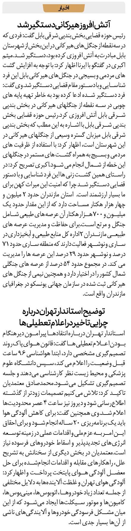 رئیس حوزه قضایی بخش بندپی شرقی بابل گفت: فردی که در سه نقطه از جنگلهای هیرکانی در این بخش از شهرستان بابل مبادرت به آتش افروزی کرده بود، دستگیر شد.میثم اکبری در گفتگو با ایرنا اظهار کرد: با توجه به افزایش گشت های مردمی و بسیجی در جنگلهای هیرکانی بابل این فرد شناسایی و با دستور مقام قضایی دستگیر شد.وی گفت: فرد دستگیر شده ادعا کرده بود به خاطر تهیه پایه های چوبی در سه نقطه از جنگلهای هیرکانی در بخش بندپی شرقی بابل آتش افروزی کرد.رئیس حوزه قضایی بخش بندپی شرقی بابل با اشاره به این مطلب که بخش بندپی شرقی بابل میزبان گستره وسیعی از جنگلهای هیرکانی در این شهرستان است، اظهار کرد: با استفاده از ظرفیت های مردمی و بسیج به همراه گشت های مستمر در جنگلهای این خطه از شمال انجام می شود.اکبری تصریح کرد: در راستای همین گشت زنی ها این فرد شناسایی و با دستور قضایی دستگیر شد چرا که امنیت این میراث کهن برای ما بسیار ارزشمند است. استان مازندران حدود ۲ میلیون و چهار هزار هکتار مساحت دارد که از این مقدار حدود یک میلیون و ۷۰۰ هزار هکتار آن عرصه های طبیعی شامل جنگل و مرتع است.برای حفاظت و مدیریت عرصه های طبیعی مازندران ۲ اداره کل منابع طبیعی و آبخیزداری در ساری و نوشهر فعالیت دارند که منطقه ساری حدود ۷۱ درصد و نوشهر حدود ۲۹ درصد این عرصه ها را مدیریت می کند. در مجموع حدود ۵۴ درصد از عرصه های جنگلی شمال کشور را در اختیار دارد و همچنین نیمی از جنگل های هیرکانی ثبت شده در سازمان جهانی یونسکو در جغرافیای مازندران واقع است.