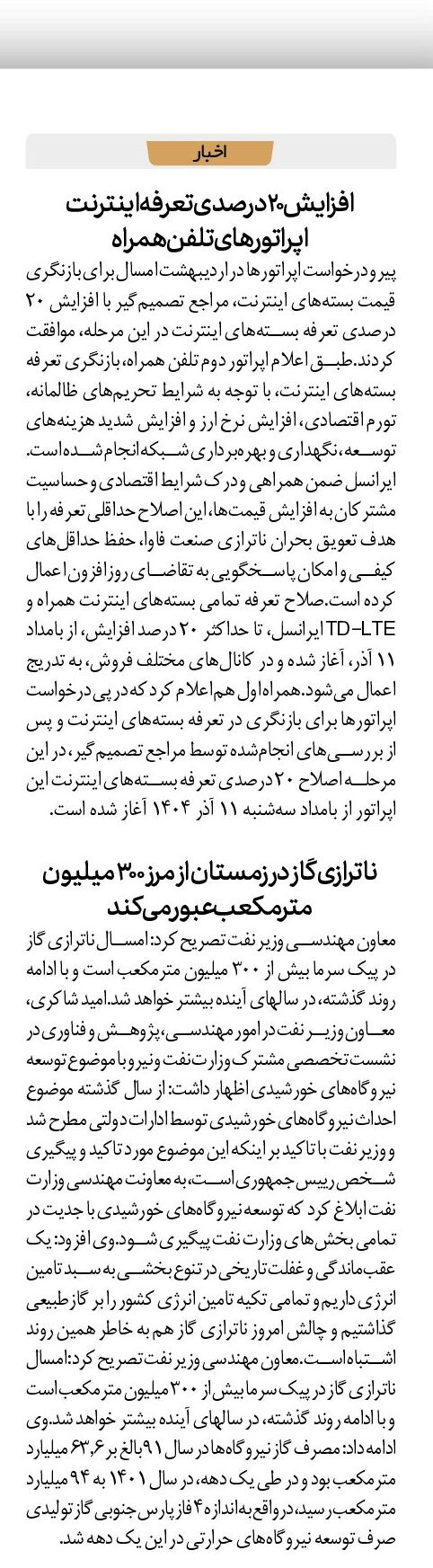 پیرو درخواست اپراتورها در اردیبهشت امسال برای بازنگری قیمت بستههای اینترنت، مراجع تصمیمگیر با افزایش 20 درصدی تعرفه بستههای اینترنت در این مرحله، موافقت کردند.طبق اعلام اپراتور دوم تلفن همراه، بازنگری تعرفه بستههای اینترنت، با توجه به شرایط تحریمهای ظالمانه، تورم اقتصادی، افزایش نرخ ارز و افزایش شدید هزینههای توسعه، نگهداری و بهرهبرداری شبکه انجام شده است.ایرانسل ضمن همراهی و درک شرایط اقتصادی و حساسیت مشترکان به افزایش قیمتها، این اصلاح حداقلی تعرفه را با هدف تعویق بحران ناترازی صنعت فاوا، حفظ حداقلهای کیفی و امکان پاسخگویی به تقاضای روزافزون اعمال کرده است.صلاح تعرفه تمامی بستههای اینترنت همراه و TD-LTE ایرانسل، تا حداکثر 20 درصد افزایش، از بامداد 11 آذر، آغاز شده و در کانالهای مختلف فروش، به تدریج اعمال میشود.همراه اول هم اعلام کرد که در پی درخواست اپراتورها برای بازنگری در تعرفه بستههای اینترنت و پس از بررسیهای انجامشده توسط مراجع تصمیمگیر، در این مرحله اصلاح 20 درصدی تعرفه بستههای اینترنت این اپراتور از بامداد سهشنبه 11 آذر 1404 آغاز شده است.