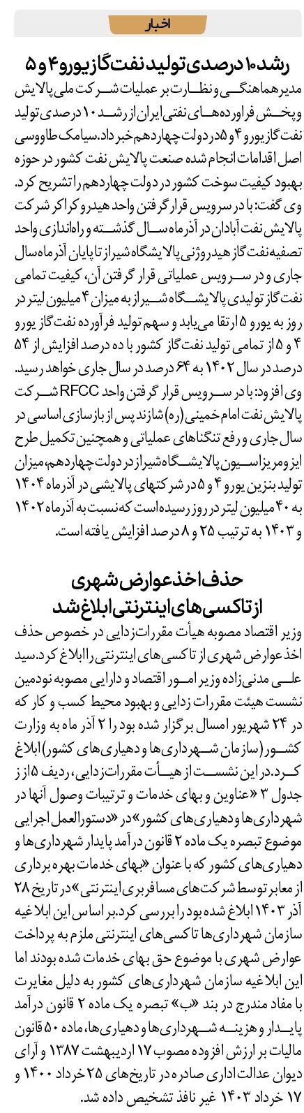 مدیرهماهنگی و نظارت بر عملیات شرکت ملی پالایش و پخش فراوردههای نفتی ایران از رشد ۱۰ درصدی تولید نفتگاز یورو ۴ و ۵ در دولت چهاردهم خبر داد.سیامک طاووسی اصل اقدامات انجام شده صنعت پالایش نفت کشور در حوزه بهبود کیفیت سوخت کشور در دولت چهاردهم را تشریح کرد.وی گفت: با در سرویس قرارگرفتن واحد هیدروکراکر شرکت پالایش نفت آبادان در آذرماه سال گذشته و راهاندازی واحد تصفیه نفتگاز هیدروژنی پالایشگاه شیراز تا پایان آذرماه سال جاری و در سرویس عملیاتی قرار گرفتن آن، کیفیت تمامی نفتگاز تولیدی پالایشگاه شیراز به میزان ۴ میلیون لیتر در روز به یورو ۵ ارتقا مییابد و سهم تولید فرآورده نفتگاز یورو ۴ و ۵ از تمامی تولید نفتگاز کشور با ده درصد افزایش از ۵۴ درصد در سال ۱۴۰۲ به ۶۴ درصد در سال جاری خواهد رسید.وی افزود: با در سرویس قرار گرفتن واحد RFCC شرکت پالایش نفت امام خمینی (ره) شازند پس از بازسازی اساسی در سال جاری و رفع تنگناهای عملیاتی و همچنین تکمیل طرح ایزومریزاسیون پالایشگاه شیراز در دولت چهاردهم، میزان تولید بنزین یورو ۴ و ۵ در شرکتهای پالایشی در آذرماه ۱۴۰۴ به ۴۰ میلیون لیتر در روز رسیده است که نسبت به آذرماه ۱۴۰۲ و ۱۴۰۳ به ترتیب ۲۵ و ۸ درصد افزایش یافته است.