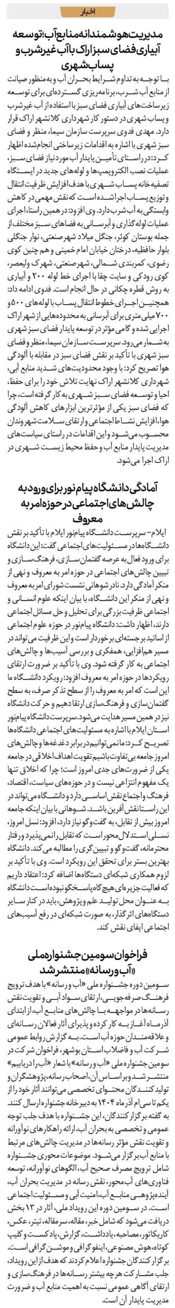 سومین دوره جشنواره ملی «آب و رسانه» با هدف ترویج فرهنگ صرفهجویی، ارتقای سواد آبی و تقویت نقش رسانهها در مواجهه با چالشهای منابع آب، از ابتدای آذرماه آغاز به کار کرده و پذیرای آثار فعالان رسانهای و علاقهمندان حوزه آب است. به گزارش روابط عمومی شرکت آب و فاضلاب استان بوشهر، فراخوان شرکت در سومین جشنواره ملی «آب و رسانه» با شعار «آب را دریابیم» منتشر شد و بر اساس آن، اصحاب رسانه، پژوهشگران و تولیدکنندگان محتوای تخصصی میتوانند آثار خود را از یکم تا سیام آذرماه ۱۴۰۴ به دبیرخانه جشنواره ارسال کنند. به گفته برگزارکنندگان، این جشنواره با هدف جلب توجه عمومی و تخصصی به بحران آب، ارائه راهکارهای نوآورانه و تقویت نقش مؤثر رسانهها در مدیریت چالشهای مرتبط با منابع آب برگزار میشود. موضوعات محوری جشنواره شامل ترویج مصرف صحیح آب، الگوهای نوآورانه، توسعه فناوریهای آبمحور، نقش رسانه در مدیریت بحران آب، آیندهپژوهی منابع آب، امنیت آبی و مسئولیت اجتماعی است. در سومین دوره این رویداد ملی، آثار در ۱۳ بخش دریافت میشود که شامل خبر، مقاله، سرمقاله، تیتر، عکس، کاریکاتور، مصاحبه، یادداشت، گزارش، پادکست و کلیپ کوتاه، هوش مصنوعی، اینفوگرافی و موشنگرافی است. برگزارکنندگان جشنواره اعلام کردند که هدف از این رویداد، جلب مشارکت هرچه بیشتر رسانهها در فرهنگسازی و ارتقای آگاهی عمومی نسبت به اهمیت منابع آب و ضرورت مدیریت پایدار آن است.