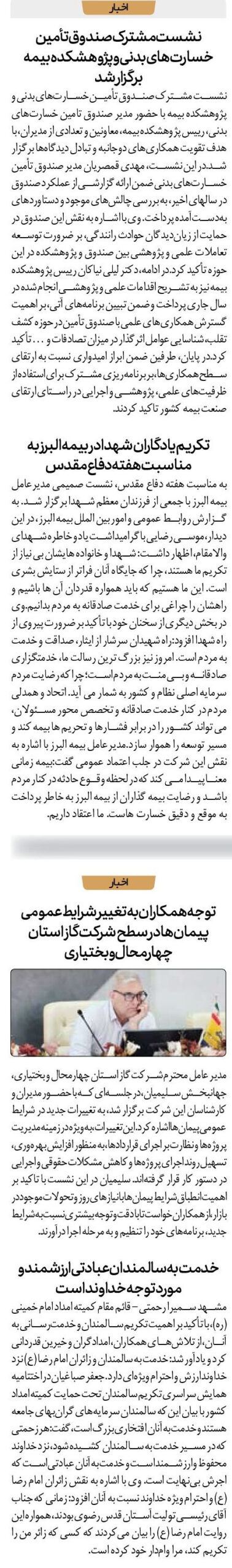 به مناسبت هفته دفاع مقدس، نشست صمیمی مدیرعامل بیمه البرز با جمعی از فرزندان معظم شهدا برگزار شد. به گزارش روابط عمومی و امور بین الملل بیمه البرز، در این دیدار، موسی رضایی با گرامیداشت یاد و خاطره شهدای والامقام، اظهار داشت: شهدا و خانواده هایشان بی نیاز از تکریم ما هستند، چرا که جایگاه آنان فراتر از ستایش بشری است. این ما هستیم که باید همواره قدردان آن ها باشیم و راهشان را چراغی برای خدمت صادقانه به مردم بدانیم.وی در بخش دیگری از سخنان خود با تأکید بر ضرورت پیروی از راه شهدا افزود:راه شهیدان سرشار از ایثار، صداقت و خدمت به مردم است. امروز نیز بزرگ ترین رسالت ما، خدمتگزاری صادقانه و بی منت به مردم است؛ چرا که رضایت مردم سرمایه اصلی نظام و کشور به شمار می آید. اتحاد و همدلی مردم در کنار خدمت صادقانه و تخصص محور مسئولان، می تواند کشور را در برابر فشارها و تحریم ها بیمه کند و مسیر توسعه را هموار سازد.مدیرعامل بیمه البرز با اشاره به نقش این شرکت در جلب اعتماد عمومی گفت:بیمه زمانی معنا پیدا می کند که در لحظه وقوع حادثه در کنار مردم باشد و رضایت بیمه گذاران از بیمه البرز به خاطر پرداخت به موقع و دقیق خسارت هاست. ما اعتقاد داریم.