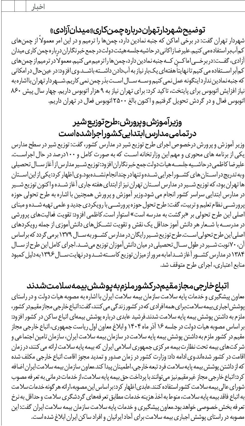 شهردار تهران گفت: در برخی اماکن که جنبه نمادین دارد، چمنها را ترمیم و در این امر معمولاً از چمنهای کمآببر استفاده میکنیم.علیرضا زاکانی در حاشیه جلسه هیئت دولت در جمع خبرنگاران درباره چمنکاری میدان آزادی، گفت: در برخی اماکن که جنبه نمادین دارد، چمنها را ترمیم میکنیم. معمولاً در ترمیم از چمنهای کمآبر استفاده میکنیم تا نهایتاً هفتهای یکبار نیاز به آبدادن داشته باشد.وی افزود: در عینحال در امکانی که جنبه نمادین ندارد اینگونه عمل نمیکنیم و سه سال است بذر چمن نمیکاریم.شهردار تهران با اشاره به نیاز افزایش اتوبوس برای پایتخت، تاکید کرد: برای تهران نیاز به ۹ هزار اتوبوس داریم. چهار سال پیش ۸۶۰ اتوبوس فعال و در گردش تحویل گرفتیم و اکنون بالغ ۲۵۰۰ اتوبوس فعال در تهران داریم.