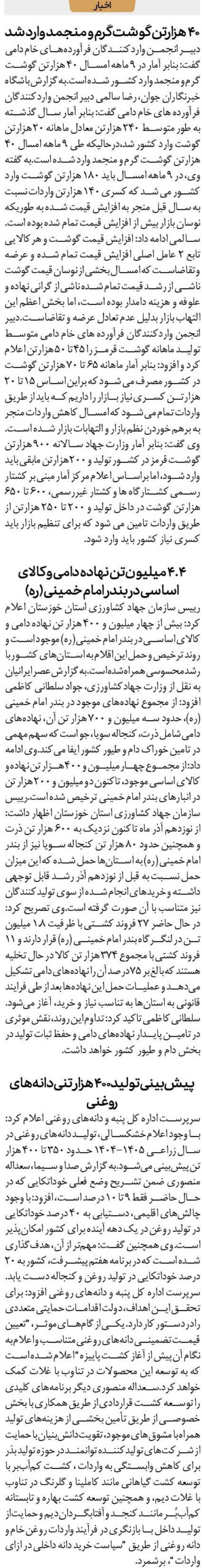 رییس سازمان جهاد کشاورزی استان خوزستان اعلام کرد: بیش از چهار میلیون و ۴۰۰ هزار تن نهاده دامی و کالای اساسی در بندر امام خمینی (ره) موجود است و روند ترخیص و حمل این اقلام به استان‌های کشور با رشد محسوسی همراه شده است.به گزارش عصرایرانیان به نقل از وزارت جهادکشاورزی، جواد سلطانی کاظمی افزود: از مجموع نهاده‌های موجود در بندر امام خمینی (ره)، حدود سه میلیون و ۷۰۰ هزار تن آن، نهاده‌های دامی شامل ذرت، کنجاله سویا، جو است که سهم مهمی در تامین خوراک دام و طیور کشور ایفا می‌کند.وی ادامه داد: از مجموع چهار میلیون و ۴۰۰ هزار تن نهاده و کالای اساسی موجود، تاکنون دو میلیون و ۲۰۰ هزار تن در انبارهای بندر امام خمینی ترخیص شده است.رییس سازمان جهاد کشاورزی استان خوزستان اظهار داشت: از نوزدهم آذر ماه تاکنون نزدیک به ۶۰۰ هزار تن ذرت و همچنین حدود ۸۰ هزار تن کنجاله سویا نیز از بندر امام خمینی (ره) به استان‌ها حمل شده که این میزان حمل نسبت به قبل از نوزدهم آذر رشد قابل توجهی داشته و خریدهای انجام ‌شده از سوی تولیدکنندگان نیز متناسب با آن صورت گرفته است.وی تصریح کرد: در حال حاضر ۲۷ فروند کشتی با ظرفیت ۱.۸ میلیون تن در لنگرگاه بندر امام خمینی (ره) قرار دارند و ۱۱ فروند کشتی با مجموع ۳۷۴ هزار تن کالا در حال تخلیه هستند که بالغ بر 75 درصد آن را نهاده‌های دامی تشکیل می‌دهد و عملیات حمل این نهاده‌ها بعد از طی فرایند قانونی به استان‌ها به تناسب نیاز و خرید، آغاز می‌شود.سلطانی کاظمی تاکید کرد: تداوم این روند، نقش موثری در تامین پایدار نهاده‌های دامی و حفظ ثبات تولید در بخش دام و طیور کشور خواهد داشت.
