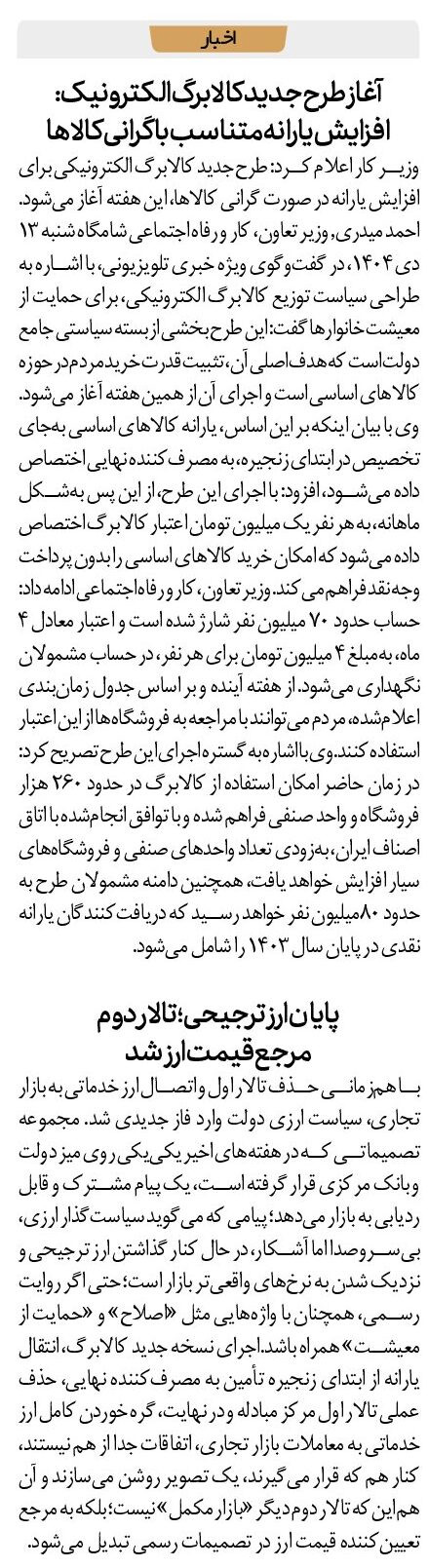 وزیر کار اعلام کرد: طرح جدید کالابرگ الکترونیکی برای افزایش یارانه در صورت گرانی کالاها، این هفته آغاز می‌شود. احمد میدری, وزیر تعاون، کار و رفاه اجتماعی شامگاه شنبه 13 دی 1404، در گفت‌وگوی ویژه خبری تلویزیونی، با اشاره به طراحی سیاست توزیع کالابرگ الکترونیکی، برای حمایت از معیشت خانوارها گفت: این طرح بخشی از بسته سیاستی جامع دولت است که هدف اصلی آن، تثبیت قدرت خرید مردم در حوزه کالاهای اساسی است و اجرای آن از همین هفته آغاز می‌شود.وی با بیان اینکه بر این اساس، یارانه کالاهای اساسی به‌جای تخصیص در ابتدای زنجیره، به مصرف‌کننده نهایی اختصاص داده می‌شود، افزود: با اجرای این طرح، از این پس به‌شکل ماهانه، به هر نفر یک میلیون تومان اعتبار کالابرگ اختصاص داده می‌شود که امکان خرید کالاهای اساسی را بدون پرداخت وجه نقد فراهم می‌کند.وزیر تعاون، کار و رفاه اجتماعی ادامه داد: حساب حدود 70 میلیون نفر شارژ شده است و اعتبار معادل 4 ماه، به‌مبلغ 4 میلیون تومان برای هر نفر، در حساب مشمولان نگهداری می‌شود. از هفته آینده و بر اساس جدول زمان‌بندی اعلام‌شده، مردم می‌توانند با مراجعه به فروشگاه‌ها از این اعتبار استفاده کنند.وی با اشاره به گستره اجرای این طرح تصریح کرد: در زمان حاضر امکان استفاده از کالابرگ در حدود 260 هزار فروشگاه و واحد صنفی فراهم شده و با توافق انجام‌شده با اتاق اصناف ایران، به‌زودی تعداد واحدهای صنفی و فروشگاه‌های سیار افزایش خواهد یافت، همچنین دامنه مشمولان طرح به حدود 80میلیون نفر خواهد رسید که دریافت‌کنندگان یارانه نقدی در پایان سال 1403 را شامل می‌شود.