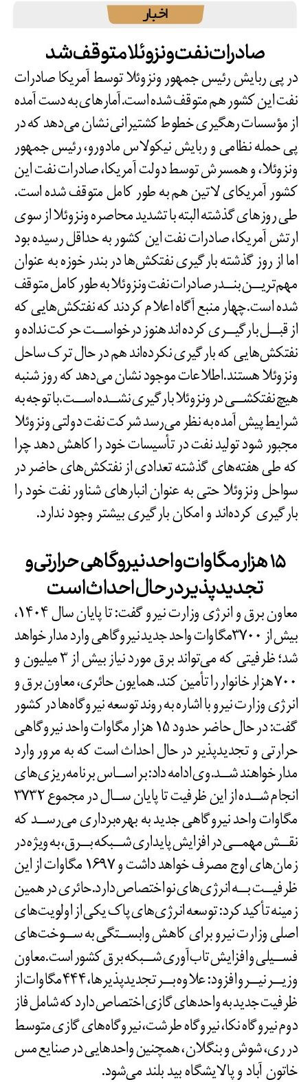 در پی ربایش رئیس جمهور ونزوئلا توسط آمریکا صادرات نفت این کشور هم متوقف شده است.آمارهای به دست آمده از مؤسسات رهگیری خطوط کشتیرانی نشان میدهد که در پی حمله نظامی و ربایش نیکولاس مادورو، رئیس جمهور ونزوئلا، و همسرش توسط دولت آمریکا، صادرات نفت این کشور آمریکای لاتین هم به طور کامل متوقف شده است.طی روزهای گذشته البته با تشدید محاصره ونزوئلا از سوی ارتش آمریکا، صادرات نفت این کشور به حداقل رسیده بود اما از روز گذشته بارگیری نفتکشها در بندر خوزه به عنوان مهمترین بندر صادرات نفت ونزوئلا به طور کامل متوقف شده است.چهار منبع آگاه اعلام کردند که نفتکشهایی که از قبل بارگیری کرده اند هنوز درخواست حرکت نداده و نفتکشهایی که بارگیری نکردهاند هم در حال ترک ساحل ونزوئلا هستند.اطلاعات موجود نشان میدهد که روز شنبه هیچ نفتکشی در ونزوئلا بارگیری نشده است.با توجه به شرایط پیش آمده به نظر میرسد شرکت نفت دولتی ونزوئلا مجبور شود تولید نفت در تأسیسات خود را کاهش دهد چرا که طی هفتههای گذشته تعدادی از نفتکشهای حاضر در سواحل ونزوئلا حتی به عنوان انبارهای شناور نفت خود را بارگیری کردهاند و امکان بارگیری بیشتر وجود ندارد.