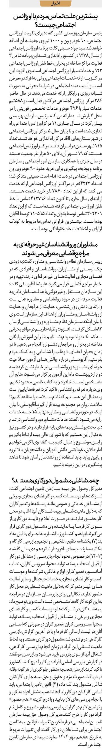 مدیرکل وصول حق بیمه سازمان تامین اجتماعی گفت: شرکتها و موسسات کسب و کار فضای مجازی و برخی از مشاغل خدماتی و عمومی مانند رسانهها و تعمیرکاران که به دلیل ماهیت شغلی، بیمهشدگان آنها اغلب در محل کار حضور ندارند، در صورت اعلام و تایید دورکاری از سوی کارفرما یا نماینده وی مشمول دورکاری قرار میگیرند.ابراهیم کشاورز با اشاره به اجرای دقیق مفاد بند(۷) بخشنامه تنقیح، تلخیص و تجمیع بازرسی کارگاه و مکاتبه معاونت بیمهای، افزود: از شانزدهم دی سال گذشته (۱۴۰۳) درخصوص نحوه انجام بازرسی از مشاغل دورکار از قبیل اصحاب رسانه، تولید محتوا، سرویس کاران، نصاب آسانسور، تعمیرکاران لوازم خانگی، شرکتها و موسسات کسب و کار فضای مجازی، خدمات دیجیتال و سایر فعالیت های غیر متمرکز که به دلیل ماهیت شغلی در محل کار حضور ندارند، تکالیفی برای بازرسان سازمان در مراجعه به این گونه کارگاهها مشخص شده است.وی توضیح داد: بیمهشدگان در شرکتها و موسسات کسب و کار فضای مجازی و برخی از مشاغل از قبیل اصحاب رسانه، تولید محتوا، سرویس کاران، تعمیرکاران در صورتی که اسامی آنان در لیست ارسالی کارفرما و یا در آخرین گزارش بازرسی کارگاهی درج شده باشد، مشمول دورکاری هستند و به لحاظ ماهیت شغلی این افراد در زمان انجام بازرسی کارگاهی، اشتغال آنها از سوی بازرس تایید میشود و بازرسان موظفند در گزارش بازرسی اسامی افراد دورکار را درج کنند.کشاورز تاکید کرد: بازرسان شعب به منظور جلوگیری از هرگونه وقفه در دریافت صورت مزد و حقوق و حق بیمه جاری کارکنان شاغل مشمول بند الف ماده (۴) قانون تامین اجتماعی، باید اسامی کارکنان دورکار را با لحاظ اهمیت شغل افراد مذکور و با انجام بررسیهای لازم تایید و با درج گزینه «عدم حضور» و توضیح لازم در گزارش بازرسی به طور مشروح و کامل نام افراد دورکار را درج کنند.مدیرکل وصول حق بیمه سازمان تامین اجتماعی درباره آخرین تغییرات قوانین بیمه تامین اجتماعی برای شاغلان دورکار گفت: این تغییرات مربوط به تاریخ هفدهم مهر ۱۴۰۴ معاونت بیمهای سازمان تامین اجتماعی است.