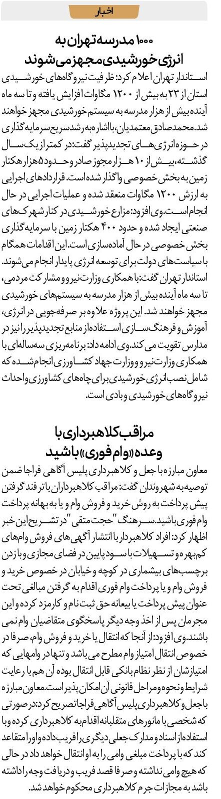استاندار تهران اعلام کرد: ظرفیت نیروگاههای خورشیدی استان از ۲۳ به بیش از ۱۲۰۰ مگاوات افزایش یافته و تا سه ماه آینده بیش از هزار مدرسه به سیستم خورشیدی مجهز خواهند شد.محمدصادق معتمدیان، با اشاره به رشد سریع سرمایهگذاری در حوزه انرژیهای تجدیدپذیر گفت: در کمتر از یک سال گذشته، بیش از ۱۰ هزار مجوز صادر و حدود ۵ هزار هکتار زمین به بخش خصوصی واگذار شده است. قراردادهای اجرایی به ارزش ۱۲۰۰ مگاوات منعقد شده و عملیات اجرایی در حال انجام است.وی افزود: مزارع خورشیدی در کنار شهرکهای صنعتی ایجاد شده و حدود ۴۰۰ هکتار زمین با سرمایهگذاری بخش خصوصی در حال آمادهسازی است. این اقدامات همگام با سیاستهای دولت برای توسعه انرژی پایدار انجام میشوند.استاندار تهران گفت: با همکاری وزارت نیرو و مشارکت مردمی، تا سه ماه آینده بیش از هزار مدرسه به سیستمهای خورشیدی مجهز خواهند شد. این پروژه علاوه بر صرفهجویی در انرژی، آموزش و فرهنگسازی استفاده از منابع تجدیدپذیر را نیز در مدارس تقویت میکند.وی ادامه داد: برنامهریزی سهسالهای با همکاری وزارت نیرو و وزارت جهاد کشاورزی انجام شده که شامل نصب انرژی خورشیدی برای چاههای کشاورزی و احداث نیروگاههای خورشیدی و بادی است.