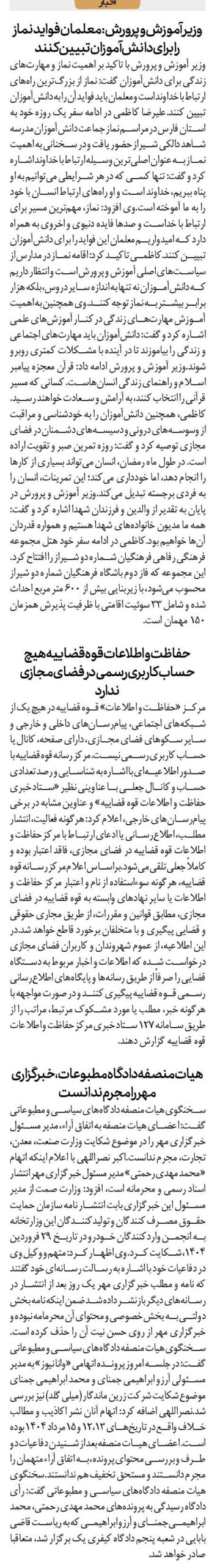 سخنگوی هیات منصفه دادگاه‌های سیاسی و مطبوعاتی گفت: اعضای هیات منصفه به اتفاق آراء، مدیر مسئول خبرگزاری مهر را در موضوع شکایت وزارت صنعت، معدن، تجارت، مجرم ندانست.اکبر نصراللهی با اعلام اینکه اتهام «محمد مهدی رحمتی» مدیر مسئول خبرگزاری مهر انتشار اسناد رسمی و محرمانه است، افزود: وزارت صمت از مدیر مسئول این خبرگزاری بابت انتشار نامه سازمان حمایت حقوق مصرف کنندگان و تولیدکنندگان این وزارتخانه به انجمن واردکنندگان خودرو در تاریخ ۲۹ فروردین ۱۴۰۴، شکایت کرد.وی اظهار کرد: متهم و وکیل وی در دفاعیات خود با اشاره به رسالت رسانه‌ای خود گفتند که نامه و مطلب خبرگزاری مهر یک روز بعد از انتشار در رسانه‌های دیگر بازنشر داده شد ضمن اینکه نامه بخش دولتی به بخش خصوصی و محتوای آن محرمامه نبوده و خبرگزاری مهر از روی حسن نیت آن را حذف کرده است.سخنگوی هیات منصفه دادگاه‌های سیاسی و مطبوعاتی گفت: در جلسه امروز پرونده اتهامی «وانا نیوز» به مدیر مسئولی آرزو ابراهیمی جمنای و محمد ابراهیمی جمنای موضوع شکایت شرکت زرین ماندگار (میلی گلد) نیز بررسی شد.نصراللهی اضافه کرد: اتهام آنان نشر اکاذیب و مطالب خلاف واقع در تاریخ‌های ۱۲،۱۳ و ۱۵مرداد ۱۴۰۴ بوده است. اعضای هیات منصفه بعد از شنیدن دفاعیات دو طرف و بررسی محتوای پرونده، به اتفاق آراء متهمان را مجرم دانستند و مستحق تخفیف هم ندانستند.سخنگوی هیات منصفه دادگاه‌های سیاسی و مطبوعاتی گفت: رأی دادگاه رسیدگی به پرونده‌های محمد مهدی رحمتی، محمد ابراهیمی جمنای و آرزو ابراهیمی که به ریاست قاضی بابایی در شعبه پنجم دادگاه کیفری یک برگزار شد، متعاقبا صادر خواهد شد.