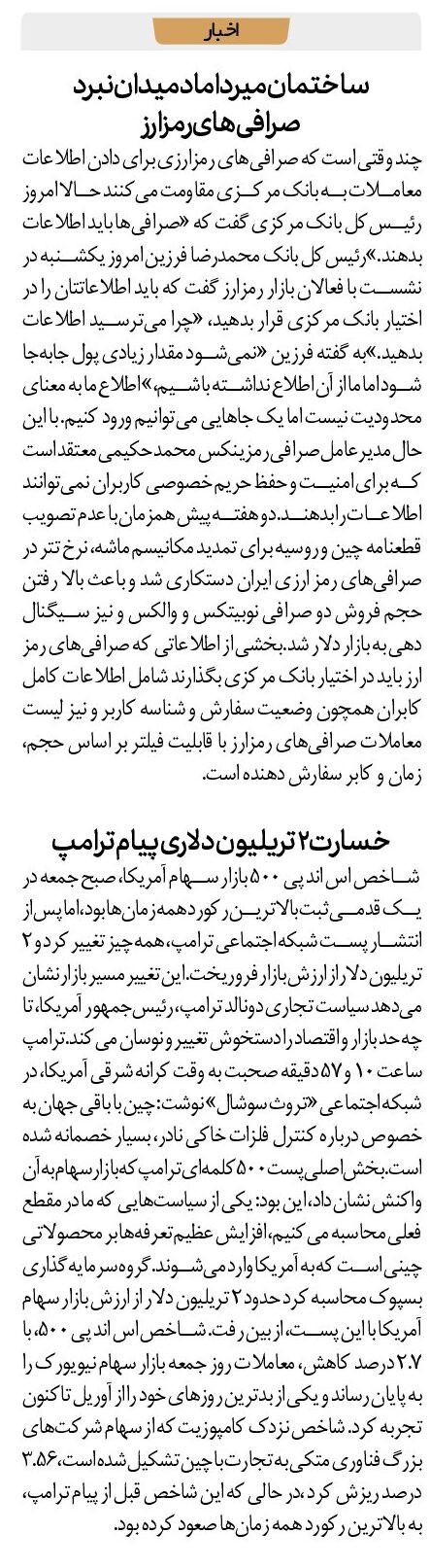 چند وقتی است که صرافی‌های رمزارزی برای دادن اطلاعات معاملات به بانک مرکزی مقاومت می‌کنند حالا امروز رئیس‌کل بانک مرکزی گفت که «صرافی‌ها باید اطلاعات بدهند.»رئیس‌کل بانک محمدرضا فرزین امروز یکشنبه در نشست با فعالان بازار رمزارز گفت که باید اطلاعاتتان را در اختیار بانک مرکزی قرار بدهید، «چرا می‌ترسید اطلاعات بدهید.»به گفته فرزین «نمی‌شود مقدار زیادی پول جابه‌جا شود اما ما از آن اطلاع نداشته باشیم،» اطلاع ما به معنای محدودیت نیست اما یک جاهایی می‌توانیم ورود کنیم. با این حال مدیرعامل صرافی رمزینکس محمد حکیمی معتقد است که برای امنیت و حفظ حریم خصوصی کاربران نمی‌توانند اطلاعات را بدهند. دو هفته پیش همزمان با عدم تصویب قطعنامه چین و روسیه برای تمدید مکانیسم ماشه، نرخ تتر در صرافی‌های رمز ارزی ایران دستکاری شد و باعث بالا رفتن حجم فروش دو صرافی نوبیتکس و والکس و نیز سیگنال دهی به بازار دلار شد.بخشی از اطلاعاتی که صرافی‌های رمز ارز باید در اختیار بانک مرکزی بگذارند شامل اطلاعات کامل کابران همچون وضعیت سفارش و شناسه کاربر و نیز لیست معاملات صرافی‌های رمزارز با قابلیت فیلتر بر اساس حجم، زمان و کابر سفارش دهنده است.