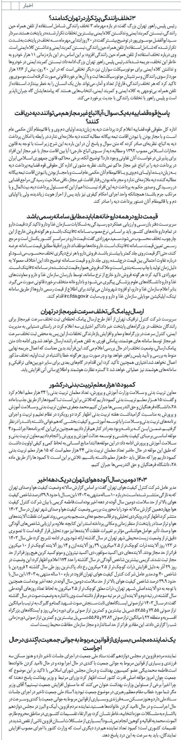 رئیس پلیس راهور تهران بزرگ گفت: در بازه مهرماه، ۳ تخلف رانندگی شامل استفاده از تلفن همراه حین رانندگی، نبستن کمربند ایمنی و نداشتن کلاه ایمنی بیشترین تخلفات تکرار شده در پایتخت هستند.سردار سید ابوالفضل موسوی‌پور در توضیح بیشتر گفت: در ۲۰ روز ابتدایی مهرماه، سه تخلف در پایتخت به شدت تکرار شده که شامل استفاده از تلفن همراه حین رانندگی، نبستن کمربند ایمنی و نداشتن کلاه ایمنی است.وی درباره تخلف استفاده از تلفن همراه حین رانندگی افزود: بر این اساس، در این بازه زمانی ۱۱ هزار خودرو به خاطر این تخلف، جریمه شده‌اند.رئیس پلیس راهور تهران بزرگ ادامه داد: نبستن کمربند ایمنی در خودروها و نداشتن کلاه ایمنی برای موتورسیکلت سواران نیز، دیگر تخلفی است که در این ۲۰ روز، بیش از ۱۲۶ هزار مورد از سوی رانندگان و سرنشینان موتورسیکلت‌ها ثبت و با آن‌ها برخورد قانونی صورت گرفته است.موسوی‌پور تاکید کرد که هر تخلف رانندگی، فارغ از تعداد و آمار، می‌تواند جان یک انسان را به خطر بیندازد. استفاده از تلفن همراه، بی‌توجهی به کلاه ایمنی و کمربند ایمنی، انتخاب‌هایی هستند که پیامدهایشان گاه جبران‌ناپذیر است و پلیس راهور با تخلفات رانندگی با جدیت برخورد می‌کند.