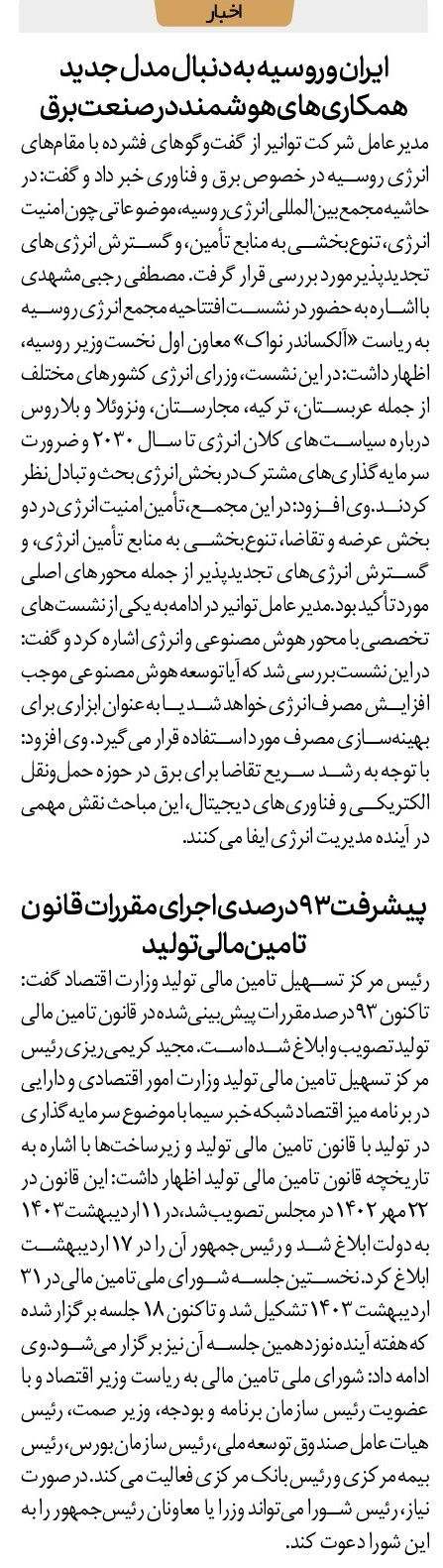 مدیرعامل شرکت توانیر از گفتوگوهای فشرده با مقامهای انرژی روسیه در خصوص برق و فناوری خبر داد و گفت: در حاشیه مجمع بینالمللی انرژی روسیه، موضوعاتی چون امنیت انرژی، تنوعبخشی به منابع تأمین، و گسترش انرژیهای تجدیدپذیرمورد بررسی قرار گرفت. مصطفی رجبیمشهدی با اشاره به حضور در نشست افتتاحیه مجمع انرژی روسیه به ریاست «آلکساندر نواک» معاون اول نخستوزیر روسیه، اظهار داشت: در این نشست، وزرای انرژی کشورهای مختلف از جمله عربستان، ترکیه، مجارستان، ونزوئلا و بلاروس درباره سیاستهای کلان انرژی تا سال 2030 و ضرورت سرمایهگذاریهای مشترک در بخش انرژی بحث و تبادلنظر کردند.وی افزود: در این مجمع، تأمین امنیت انرژی در دو بخش عرضه و تقاضا، تنوعبخشی به منابع تأمین انرژی، و گسترش انرژیهای تجدیدپذیر از جمله محورهای اصلی مورد تأکید بود.مدیرعامل توانیر در ادامه به یکی از نشستهای تخصصی با محور هوش مصنوعی و انرژی اشاره کرد و گفت: در این نشست بررسی شد که آیا توسعه هوش مصنوعی موجب افزایش مصرف انرژی خواهد شد یا بهعنوان ابزاری برای بهینهسازی مصرف مورد استفاده قرار میگیرد. وی افزود: با توجه به رشد سریع تقاضا برای برق در حوزه حملونقل الکتریکی و فناوریهای دیجیتال، این مباحث نقش مهمی در آینده مدیریت انرژی ایفا میکنند.