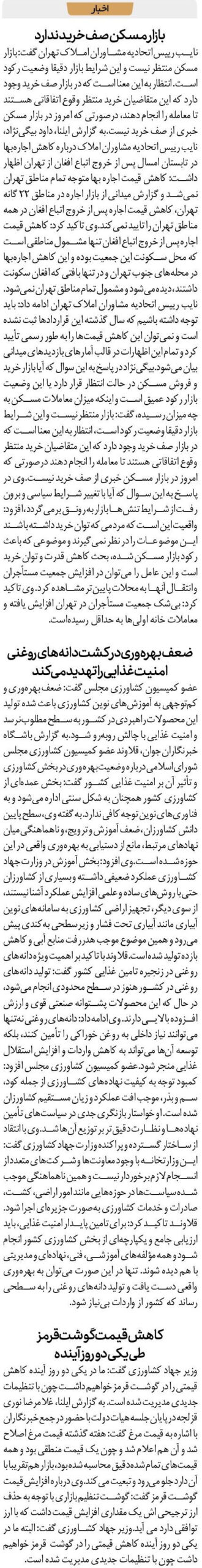 وزیر جهاد کشاورزی گفت: ما در یکی دو روز آینده کاهش قیمتی را در گوشت قرمز خواهیم داشت چون با تنظیمات جدیدی مدیریت شده است. به گزارش ایلنا، غلامرضا نوری قزلجه در پایان جلسه هیات دولت با حضور در جمع خبرنگاران با اشاره به قیمت مرغ گفت: هفته گذشته قیمت مرغ اصلاح شد و آن هم اعلام شد و چون یک قیمت منطقی بود و همه قیمتهای تمام شده دقیق محاسبه شده بود، بازار هم تقریبا با آن دارد جلو میرود و تبعیت میکند.وی درباره افزایش قیمت گوشت قرمز گفت: گوشت تنظیم بازاری با توجه به حذف ارز ترجیحی اش یک مقداری افزایش قیمت داشت که با ارز توافقی دارد می آید.وزیر جهاد کشاورزی گفت: البته ما در یکی دو روز آینده کاهش قیمتی را در گوشت قرمز خواهیم داشت چون با تنظیمات جدیدی مدیریت شده است.