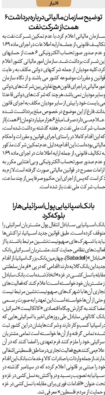 سازمان مالیاتی اعلام کرد، با عدم تمکین شرکت نفت به تکالیف قانونی، از جمله ارایه اطلاعات در اجرای ماده 169 و عدم صدور صورتحساب الکترونیکی 6 همت از حسابهای این شرکت برداشت شد. سازمان امور مالیاتی کشور اعلام کرد،کلیه مودیان از جمله شرکتهای دولتی مکلف به رعایت قوانین و مقررات موضوعه کشور می باشند و از نگاه سازمان امور مالیاتی در اجرای قانون هیچ تفاوتی بین شرکتهای دولتی و سایر مودیان نمی باشد، هرچند که شرکتهای دولتی قاعدتا می بایست خود را بیش از سایر مودیان مکلف به اجرای قانون بدانند.فارغ از این موضوع در خصوص مبلغ بردداشت شده اعلام می دارد صرفا مبلغ 6 هزار میلیارد تومان (6 همت) از حساب شرکت ملی نفت در هفته گذشته برداشت شده است، که این اقدام کاملا در راستای اجرای قوانین و مقررات و احکام مالیاتی بوده است.این اقدام به دلیل عدم تمکین شرکت مذکور به تکالیف قانونی، از جمله ارایه اطلاعات در اجرای ماده 169 و عدم صدور صورتحساب الکترونیکی و بیاعتنایی مکرر به الزامات مصرح در قوانین مالیاتی صورت گرفته است.لازم به ذکر است که پس از اجرای این حکم و صرفا پس از چند ساعت، حساب شرکت ملی نفت باز شده است.
