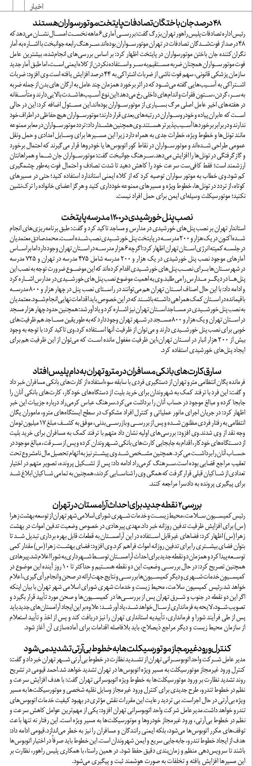 رئیس اداره تصادفات پلیس راهور تهران بزرگ گفت: بررسی آماری ۶ ماهه نخست امسال نشان می‌دهد که ۴۸ درصد از فوت‌شدگان تصادفات در تهران موتورسواران بوده‌اند.سرهنگ رابعه جوانبخت با اشاره به آمار نگران‌کننده جان باختن موتورسواران در پایتخت اظهار کرد: بر اساس بررسی‌های انجام‌شده، بیشترین عامل فوت موتورسواران همچنان ضربه مستقیم به سر و استفاده نکردن از کلاه ایمنی است، اما طبق آمار جدید سازمان پزشکی قانونی، سهم فوت ناشی از ضربات اشتراکی به ۴۴ درصد افزایش یافته است.وی افزود: ضربات اشتراکی به آسیب‌هایی گفته می‌شود که در اثر برخورد همزمان چند عامل به ارگان های بدن از جمله ضربه به سر، گردن، ستون فقرات و اندام‌های داخلی رخ می‌دهد؛ این نوع آسیب‌ها شدت بالایی دارند و متأسفانه در هفته‌های اخیر عامل اصلی مرگ بسیاری از موتورسواران بوده‌اند.این مسئول اضافه کرد: این در حالی است که عابران پیاده و خودروسواران در رتبه‌های بعدی قرار دارند؛ موتورسواران هیچ حفاظی در اطراف خود ندارند و در برابر برخوردها آسیب‌پذیرتر هستند.وی همچنین هشدار داد: تردد موتورسواران در معابر ممنوعه مانند تونل‌ها و خطوط ویژه، خطرات جدی به همراه دارد زیرا این مسیرها برای وسایل امدادی و حمل‌ ونقل عمومی طراحی شده‌اند و موتورسواران در نقاط کور اتوبوس‌ها یا خودروها قرار می‌گیرند که احتمال برخورد و گازگرفتگی در تونل‌ها را افزایش می‌دهد.سرهنگ جوانبخت گفت: موتورسواران جان شما و همراهانتان ارزشمند است؛ فقط کافی‌ست سرعت خود را کاهش دهید تا شدت تصادف و احتمال فوت به‌طور چشمگیری کم شود.وی خطاب به موتور سواران توصیه کرد که از کلاه ایمنی استاندارد استفاده کنید؛ حتی در مسیرهای کوتاه، از تردد در تونل‌ها، خطوط ویژه و مسیرهای ممنوعه خودداری کنید و هرگز اعضای خانواده را ترک‌نشین نکنید؛ موتورسیکلت وسیله‌ای ایمن برای حمل افراد نیست.