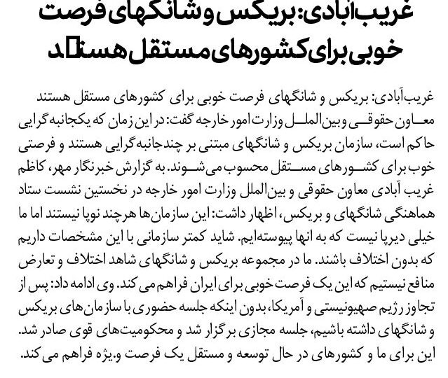 غریب‌آبادی: بریکس و شانگهای فرصت خوبی برای کشورهای مستقل هستند