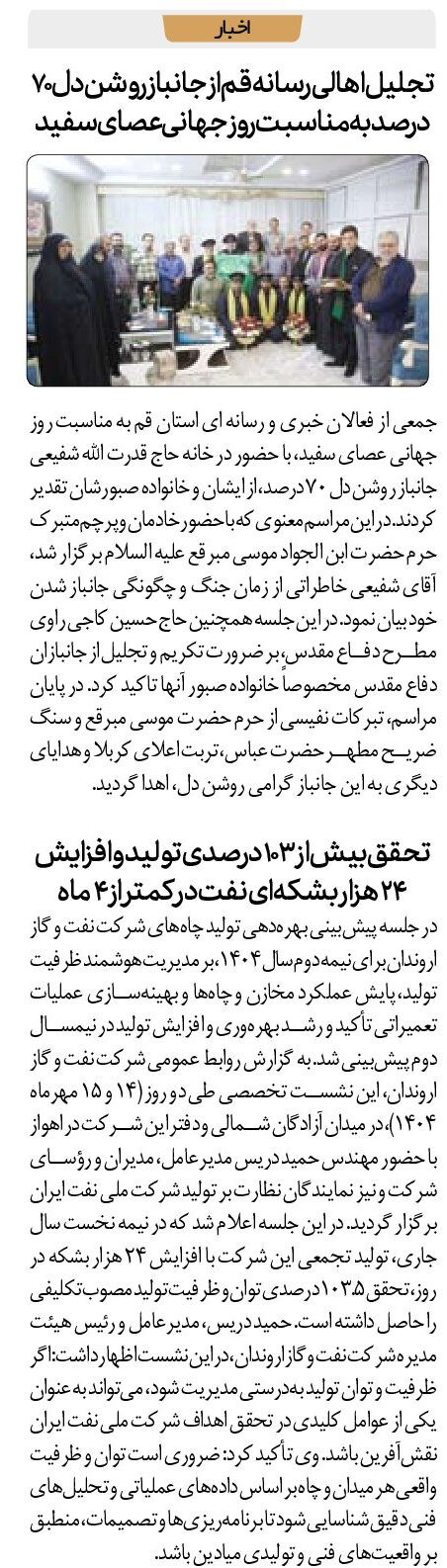 جمعی از فعالان خبری و رسانه ای استان قم به مناسبت روز جهانی عصای سفید، با حضور در خانه حاج قدرت الله شفیعی جانباز روشن دل ۷۰ درصد، از ایشان و خانواده صبورشان تقدیر کردند. در این مراسم معنوی که با حضور خادمان و پرچم متبرک حرم حضرت ابن الجواد موسی مبرقع علیه السلام برگزار شد، آقای شفیعی خاطراتی از زمان جنگ و چگونگی جانباز شدن خود بیان نمود. در این جلسه همچنین حاج حسین کاجی راوی مطرح دفاع مقدس، بر ضرورت تکریم و تجلیل از جانبازان دفاع مقدس مخصوصاً خانواده صبور آنها تاکید کرد. در پایان مراسم، تبرکات نفیسی از حرم حضرت موسی مبرقع و سنگ ضریح مطهر حضرت عباس، تربت اعلای کربلا و هدایای دیگری به این جانباز گرامی روشن دل، اهدا گردید.