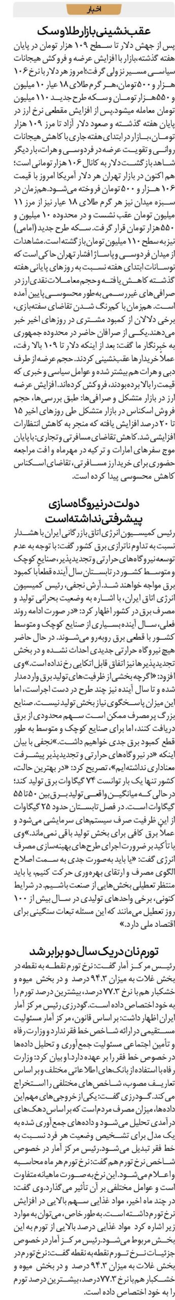 رئیس مرکز آمار گفت: نرخ تورم نقطه به نقطه در بخش غلات به میزان ۹۴.۳ درصد و در بخش میوه و خشکبار هم با نرخ ۷۷.۳ درصد، بیشترین درصد تورم را به خود اختصاص داده است.گودرزی رئیس مرکز آمار ایران اظهار داشت: بر اساس قانون، مرکز آمار مسئولیت مستقیمی در ارائه شاخص خط فقر ندارد و وزارت رفاه و تأمین اجتماعی مسئولیت جمعآوری و تحلیل دادهها در خصوص خط فقر را بر عهده دارد.او بیان کرد: وزارت رفاه با استفاده از بانکهای اطلاعاتی مختلف و بر اساس تعاریف مصوب، شاخصهای مختلفی را استخراج میکند.گودرزی گفت: یکی از خروجیهای مهم این دادهها، میزان مصرف مردم است که بر اساس دهکهای درآمدی تحلیل میشود و دادههای جمعآوری شده به یک مدل برای تشخیص وضعیت هر فرد نسبت به خط فقر تبدیل میشود.رئیس مرکز آمار در خصوص شاخص نرخ تورم هم گفت: نرخ تورم هر ماه محاسبه و اعلام میشود. این نرخ به صورت ماهیانه متفاوت است و عوامل مختلفی بر آن تأثیر میگذارد.وی گفت: در چند ماه اخیر، مواد غذایی سهم بالایی در افزایش نرخ تورم داشته است. بهطور خاص، میتوان به موارد زیر اشاره کرد مواد غذایی درصد بالایی از تورم به این بخش مربوط میشود.رئیس مرکز آمار در خصوص جزئیات نرخ تورم نقطه به نقطه گفت: نرخ تورم در بخش غلات به میزان ۹۴.۳ درصد و در بخش میوه و خشکبار هم با نرخ ۷۷.۳ درصد، بیشترین درصد تورم را به خود اختصاص داده است.