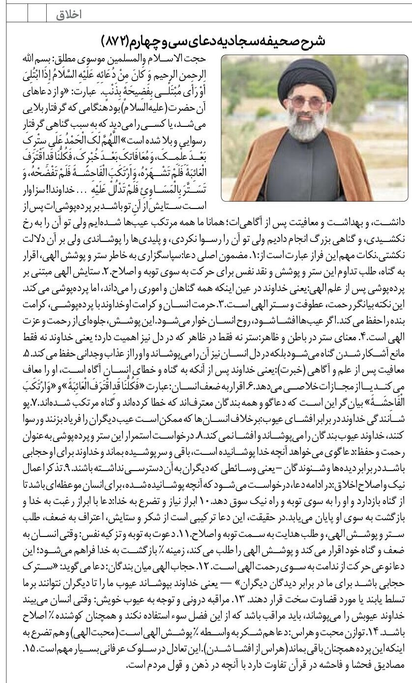 حجت الاسلام والمسلمین موسوی مطلق: بسم الله الرحمن الرحیم وَ کَانَ مِنْ دُعَائِهِ عَلَیْهِ السَّلَامُ إِذَا ابْتُلِیَ أَوْ رَأَی مُبْتَلًی بِفَضِیحَةٍ بِذَنْبٍ. عبارت: «و از دعاهای آن حضرت (علیه‌السلام) بود هنگامی که گرفتار بلایی می‌شد، یا کسی را می‌دید که به سبب گناهی گرفتار رسوایی و بلا شده است» اللَّهُمَّ لَکَ الْحَمْدُ عَلَی سِتْرِکَ بَعْدَ عِلْمِکَ، وَ مُعَافَاتِکَ بَعْدَ خُبْرِکَ، فَکُلُّنَا قَدِ اقْتَرَفَ الْعَائِبَةَ فَلَمْ تَشْهَرْهُ، وَ ارْتَکَبَ الْفَاحِشَةَ فَلَمْ تَفْضَحْهُ، وَ تَسَتَّرَ بِالْمَسَاوِئِ فَلَمْ تَدْلُلْ عَلَیْهِ … خداوندا! سزاوار است ستایش از آنِ تو باشد بر پرده‌پوشی‌ات پس از دانشت، و بهداشت و معافیتت پس از آگاهی‌ات؛ همانا ما همه مرتکب عیب‌ها شده‌ایم ولی تو آن را به رخ نکشیدی، و گناهی بزرگ انجام دادیم ولی تو آن را رسوا نکردی، و پلیدی‌ها را پوشاندی ولی بر آن دلالت نکشتی.نکات مهم این فراز عبارت است از:۱. مضمون اصلی دعا:سپاسگزاری به خاطر ستر و پوشش الهی، اقرار به گناه، طلب تداوم این ستر و پوشش و نقد نفس برای حرکت به سوی توبه و اصلاح.۲. ستایش الهی مبتنی بر پرده‌پوشی پس از علم الهی:یعنی خداوند در عین اینکه همه گناهان و اموری را می‌داند، اما پرده‌پوشی می‌کند. این نکته بیانگر رحمت، عطوفت و ستر الهی است.۳. حرمت انسان و کرامت اوخداوند با پرده‌پوشی، کرامت بنده را حفظ می‌کند. اگر عیب‌ها افشا شود، روح انسان خوار می‌شود. این پوشش، جلوه‌ای از رحمت و عزت الهی است.۴. معنای ستر در باطن و ظاهر:ستر نه فقط در ظاهر که در دل نیز اهمیت دارد؛ یعنی خداوند نه فقط مانع آشکار شدن گناه می‌شود بلکه در دل انسان نیز آن را می‌پوشاند و او را از عذاب وجدانی حفظ می‌کند.۵. معافیت پس از علم و آگاهی (خبرت):یعنی خداوند پس از آنکه به گناه و خطای انسان آگاه است، او را معاف می‌کند یا از مجازات خلاصی می‌دهد.۶. اقرار به ضعف انسان:عبارت «فَکُلُّنَا قَدِ اقْتَرَفَ الْعَائِبَةَ» و «وَ ارْتَکَبَ الْفَاحِشَةَ» بیان‌گر این است که دعاگو و همه بندگان معترف‌اند که خطا کرده‌اند و گناه مرتکب شده‌اند.۷.پو شانندگی خداوند در برابر افشای عیوب:برخلاف انسان‌ها که ممکن است عیب دیگران را فریاد بزنند و رسوا کنند، خداوند عیوب بندگان را می‌پوشاند و افشا نمی‌کند.۸. درخواست استمرار این ستر و پرده‌پوشی به‌عنوان رحمت و حفظ:دعاگوی می‌خواهد آنچه خدا پوشانیده است، باقی و سرپوشیده بماند و خداوند برای او حجابی باشد در برابر دیده‌ها و شنوندگان – یعنی وسائطی که دیگران به آن دسترسی نداشته باشند.۹. تذکر اعمال نیک و اصلاح اخلاق:در ادامه دعا، درخواست می‌شود که آنچه پوشانیده شده، برای انسان موعظه‌ای باشد تا از گناه بازدارد و او را به سوی توبه و راه نیک سوق دهد.۱۰ ابراز نیاز و تضرع به خدا:دعا با ابراز رغبت به خدا و بازگشت به سوی او پایان می‌یابد.در حقیقت، این دعا ترکیبی است از شکر و ستایش، اعتراف به ضعف، طلب ستر و پوشش الهی، و طلب هدایت به سمت توبه و اصلاح.۱۱. دعوت به توبه و تزکیه نفس: وقتی انسان به ضعف و گناه خود اقرار می‌کند و پوشش الهی را طلب می‌کند، زمینهٔ بازگشت به خدا فراهم می‌شود؛ این دعا نوعی حرکت از ندامت به سوی رحمت الهی است. ۱۲. حجاب الهی میان بندگان: دعا می‌گوید: «سترک حجابی باشد برای ما در برابر دیدگان دیگران» — یعنی خداوند بپوشاند عیوب ما را تا دیگران نتوانند برما تسلط یابند یا مورد قضاوت سخت قرار دهند. ۱۳. مراقبه درونی و توجه به عیوب خویش: وقتی انسان می‌بیند خداوند عیوبش را می‌پوشاند، باید مراقب باشد که از این فضل سوء استفاده نکند و همچنان کوشندهٔ اصلاح باشد. ۱۴. توازن محبت و هراس: دعا هم شکر به واسطهٔ پوشش الهی است (محبت الهی) و هم تضرع به اینکه این پرده همچنان باقی بماند (هراس از افشا شدن). این تعادل در سلوک عرفانی بسیار مهم است. ۱۵. مصادیق فحشا و فاحشه در قرآن تفاوت دارد با آنچه در ذهن و قول مر