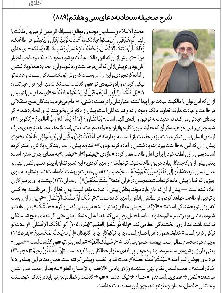 حجت الاسلام والمسلمین موسوی مطلق: بسم الله الرحمن الرحیم بَلْ مَلَکْتَ یَا إِلَهِی أَمْرَهُمْ قَبْلَ أَنْ یَمْلِکُوا عِبَادَتَکَ، وَ أَعْدَدْتَ ثَوَابَهُمْ قَبْلَ أَنْ یُفِیضُوا فِی طَاعَتِکَ، وَ ذَلِکَ أَنَّ سُنَّتَکَ الْإِفْضَالُ، وَ عَادَتَکَ الإِحْسَانُ، وَ سَبِیلَکَ الْعَفْوُ. بلکه – ای خدای من! – تو پیش از آنکه آنان مالک عبادت تو شوند،خودت مالک و صاحب اختیار آنان بودی؛و پیش از آنکه آنان در طاعتت وارد شوند و آن را انجام دهند،تو پاداششان را آماده کرده بودی.و این از آن روست که روش تو بخشندگی است،و عادت تو نیکی کردن، و راه و شیوهی تو عفو و گذشت است.نکات مهم این فراز عبارتند از: ۱.« بَلْ مَلَکْتَ یَا إِلَهِی أَمْرَهُمْ قَبْلَ أَنْ یَمْلِکُوا عِبَادَتَکَ» «ای خدای من! تو پیش از آنکه آنان توان یا مالکیت عبادت تو را پیدا کنند، اختیارشان را در دست داشتی.»• امام میفرماید: بندگان هیچ استقلالی در طاعت و عبادت ندارند؛خداوند مالک وجود، اراده و قدرت آنان است، پیش از آنکه آنان بخواهند کاری انجام دهند.• اگر بندهای عبادتی میکند، در حقیقت به توفیق و ارادهی الهی است.«وَمَا تَشَاؤُونَ إِلَّا أَنْ یَشَاءَ اللَّهُ رَبُّ الْعَالَمِینَ» (تکویر، ۲۹)شما چیزی را نمیخواهید مگر آنکه خداوند، پروردگار جهانیان، بخواهد.عبادت، نعمتی است از جانب خدا، نه نتیجهی صرف ارادهی انسان؛ پس شکر عبادت نیز در حقیقت بازگشت به او دارد.۲.«و أَعْدَدْتَ ثَوَابَهُمْ قَبْلَ أَنْ یُفِیضُوا فِی طَاعَتِکَ»«و تو پیش از آنکه آنان به طاعتت بپردازند، پاداششان را آماده کرده بودی.»• خداوند پیش از عمل بندگان، پاداش را مقدر کرده است؛ یعنی از ازل لطف خود را برای اهل طاعت مقرر کرده.• واژهی «یفیضوا» از «فیضان» به معنای جاری شدن است؛ یعنی پیش از آنکه بندگان وارد جریان طاعت شوند، تو ثوابشان را مهیا کردی.• این تعبیر نشان از پیشدستی فضل الهی بر عمل انسان دارد.«سَابِقُوا إِلَی مَغْفِرَةٍ مِنْ رَبِّکُمْ وَجَنَّةٍ…»(حدید، ۲۱)یعنی مغفرت و بهشت آماده است؛ شما بشتابید بهسوی چیزی که خدا از پیش آماده کرده است.همچنین در قرآن آمده:«أُعِدَّتْ لِلْمُتَّقِینَ» (آلعمران، ۱۳۳)بهشت برای پرهیزکاران آماده شده است — پیش از آنکه آنان وارد شوند. پاداش پیش از عبادت مقدر است؛ چون خدا از ازل میدانسته چه کسی با توفیق او طاعت خواهد کرد، و در لطفش پاداش را مهیا کرده است.۳.«و ذَلِکَ أَنَّ سُنَّتَکَ الْإِفْضَالُ»«و این از آن روست که روش تو بخشندگی است.» • «الإفضال» یعنی عطای زیادتر از استحقاق، یعنی فضل و کرم.• «سُنَّتَکَ» یعنی عادت و شیوهی دائمی تو در تدبیر عالم. خداوند اساساً با فضل رفتار میکند، نه با عدل خشک.یعنی حتی اگر بندهای هیچ شایستگی نداشته باشد، خدا از روی بخشندگی عطا میکند. «وَاللَّهُ ذُو الْفَضْلِ الْعَظِیمِ»(بقره، ۱۰۵) ۴.و عَادَتَکَ الإِحْسَانُ «و عادت تو نیکی کردن است.» خداوند همواره اهل احسان است، چه به نیکوکار، چه به گنهکار. «إِنَّ اللَّهَ یُحِبُّ الْمُحْسِنِینَ» (بقره، ۱۹۵) و چون خود محسن مطلق است، پیوسته احسان میکند. ۵.«و سَبِیلَکَ الْعَفْوُ» «و راه و روش تو عفو و گذشت است.»«سبیل» یعنی طریق و شیوهی مستمر.خداوند راه خود را بر پایهی عفو از خطاکاران بنا کرده است. «إِنَّ اللَّهَ لَغَفُورٌ رَحِیمٌ»(حجر، ۴۹)در دعای جوشن کبیر آمده:«سَبَقَتْ رَحْمَتُهُ غَضَبَهُ»رحمت خدا بر غضب او پیشی گرفته است.همین معنا در این جملهی دعا آشکار است.۶، رحمت، اساس نظام الهی است:سه واژهی پایانی «الإفضال، الإحسان، العفو» سه بعد از رحمت خدا را نشان میدهد:• فضل → عطای بیاستحقاق• احسان → نیکی دائمی• عفو → گذشت از خطا. مؤمن نیز باید در زندگی خود، سنت و عادتش «افضال، احسان و عفو» باشد، چون این سه، صفات خداست.