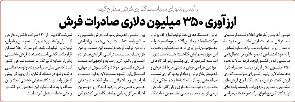طبق آخرین آمارهای اعلام شده از سوی مسئولان، صنعت فرش ماشینی حدود ۵۰ درصد از ارزش صادرات سالیانه صنایع نساجی را به خود اختصاص داده و علاوه بر اشتغال‌زایی مناسبی که در کشور ایجاد کرده، سالانه حدود ۳۵۰ میلیون دلار ارزآوری به همراه دارد.محمود تولایی رئیس شورای سیاست‌گذاری فرش گفت: در این نمایشگاه انواع فرش‌های ماشینی، صنایع و تجهیزات وابسته، واحد‌های تولید‌کنندگان نخ، انواع پارکت، واحد‌های طراحی فرش، دستگاه‌های خط تولید، انواع کف‌پوش، موکت، قطعات و ماشین‌آلات مربوطه، مواد اولیه و همچنین نوآوری در عرضه تولید و خدمات این حوزه به نمایش گذاشته شده است.وی اضافه کرد: برگزاری جشنواره و کارگاه‌های آموزشی طراحی فرش ماشینی، بازیافت فرش و کف‌پوش، نخ فرش و مواد اولیه، برگزاری نشست هم‌اندیشی روسای اتحادیه‌ها و هماهنگی برای حضور دو هیئت تجاری و بازرگانی خارجی برخی از برنامه‌های جانبی هفدهمین نمایشگاه بین‌المللی کف‌پوش، موکت، فرش ماشینی و صنایع وابسته است.تولایی همچنین افزایش راندمان تولید، توجه به توسعه این صنعت، یافتن بازار‌های جدید صادراتی، افزایش صادرات، آشنایی با نوین‌ترین صنایع و تجهیزات صنعت فرش ماشینی، موکت و کف‌پوش در جهان، اشتغال‌زایی، توجه مسئولان به این صنعت و افزایش و بالا رفتن سطح اطلاعات و دانش عمومی، علمی و فنی بازدیدکنندگان را مهمترین اهداف برگزاری این نمایشگاه بیان کرد.در این نمایشگاه بیش از ۱۲۰ شرکت داخلی و خارجی از ایران و کشور‌های ترکیه، چین و تایوان، نوین‌ترین تولیدات خود را در معرض علاقمندان قرار دادند.گفتنی است صنعت فرش ماشینی یکی از صنایع تأثیرگذار در صنعت نساجی کشور است که طی سال‌های اخیر رشد و توسعه مناسبی داشته و تنها در منطقه کاشان، آران و بیدگل بیش از هزار واحد تولیدکننده فرش ماشینی ایجاد و این منطقه را به قطب تولید این محصول در کشور و حتی منطقه تبدیل کرده است.