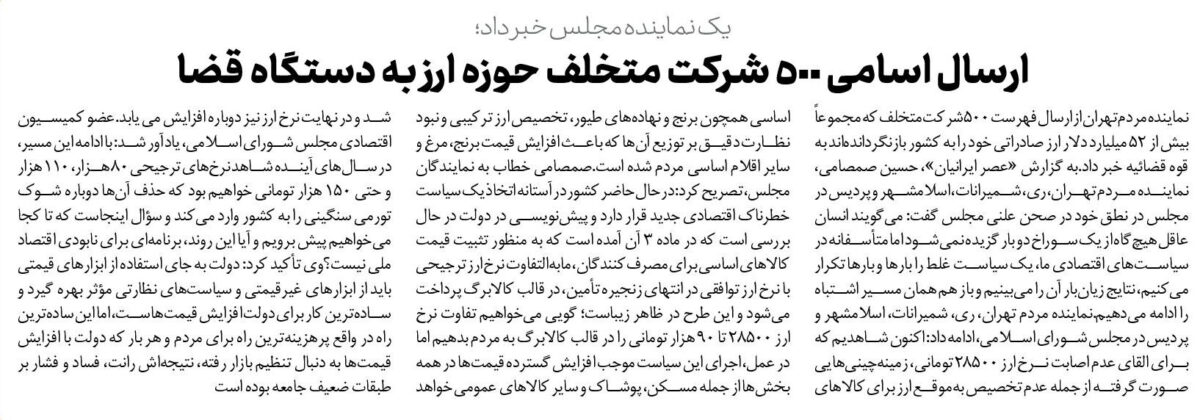 نماینده مردم تهران از ارسال فهرست 500 شرکت متخلف که مجموعاً بیش از ۵۲ میلیارد دلار ارز صادراتی خود را به کشور بازنگرداندهاند به قوه قضائیه خبر داد.به گزارش «عصر ایرانیان»، حسین صمصامی، نماینده مردم تهران، ری، شمیرانات، اسلامشهر و پردیس در مجلس در نطق خود در صحن علنی مجلس گفت: میگویند انسان عاقل هیچگاه از یک سوراخ دو بار گزیده نمیشود اما متأسفانه در سیاستهای اقتصادی ما، یک سیاست غلط را بارها و بارها تکرار میکنیم، نتایج زیانبار آن را میبینیم و باز هم همان مسیر اشتباه را ادامه میدهیم.نماینده مردم تهران، ری، شمیرانات، اسلامشهر و پردیس در مجلس شورای اسلامی، ادامه داد: اکنون شاهدیم که برای القای عدم اصابت نرخ ارز ۲۸۵۰۰ تومانی، زمینهچینیهایی صورت گرفته از جمله عدم تخصیص بهموقع ارز برای کالاهای اساسی همچون برنج و نهادههای طیور، تخصیص ارز ترکیبی و نبود نظارت دقیق بر توزیع آنها که باعث افزایش قیمت برنج، مرغ و سایر اقلام اساسی مردم شده است.صمصامی خطاب به نمایندگان مجلس، تصریح کرد: در حال حاضر کشور در آستانه اتخاذ یک سیاست خطرناک اقتصادی جدید قرار دارد و پیشنویسی در دولت در حال بررسی است که در ماده ۳ آن آمده است که به منظور تثبیت قیمت کالاهای اساسی برای مصرفکنندگان، مابهالتفاوت نرخ ارز ترجیحی با نرخ ارز توافقی در انتهای زنجیره تأمین، در قالب کالابرگ پرداخت میشود و این طرح در ظاهر زیباست؛ گویی میخواهیم تفاوت نرخ ارز ۲۸۵۰۰ تا ۹۰ هزار تومانی را در قالب کالابرگ به مردم بدهیم اما در عمل، اجرای این سیاست موجب افزایش گسترده قیمتها در همه بخشها از جمله مسکن، پوشاک و سایر کالاهای عمومی خواهد شد و در نهایت نرخ ارز نیز دوباره افزایش می یابد.عضو کمیسیون اقتصادی مجلس شورای اسلامی، یادآور شد: با ادامه این مسیر، در سالهای آینده شاهد نرخهای ترجیحی ۸۰ هزار، ۱۱۰ هزار و حتی ۱۵۰ هزار تومانی خواهیم بود که حذف آنها دوباره شوک تورمی سنگینی را به کشور وارد میکند و سؤال اینجاست که تا کجا میخواهیم پیش برویم و آیا این روند، برنامهای برای نابودی اقتصاد ملی نیست؟وی تأکید کرد: دولت به جای استفاده از ابزارهای قیمتی باید از ابزارهای غیرقیمتی و سیاستهای نظارتی مؤثر بهره گیرد و سادهترین کار برای دولت افزایش قیمتهاست، اما این سادهترین راه در واقع پرهزینهترین راه برای مردم و هر بار که دولت با افزایش قیمتها به دنبال تنظیم بازار رفته، نتیجهاش رانت، فساد و فشار بر طبقات ضعیف جامعه بوده است