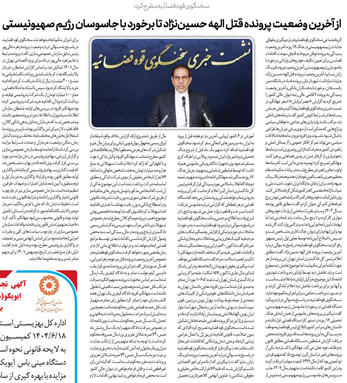 گروه اجتماعی: سخنگوی قوه قضاییه درباره پیگیری حقوقی جنایات رژیم صهیونیستی در جنگ ۱۲ روزه، آخرین وضعیت رسیدگی به پرونده توفان مربوط به قاچاق سوخت، اقدامات قضایی برای تعیین تکلیف خودروهای وارداتی، برخورد با جاسوسان رژیم صهیونیستی، آخرین وضعیت پرونده لیزینگ رایان سایپا، آخرین وضعیت پرونده قتل الهه حسیننژاد، جزئیات بازداشت شهردار بابل، پرونده فساد در باشگاه مس رفسنجان، برخورد با بدهکاران بانکی و آخرین وضعیت رسیدگی به پرونده 2 قاضی عالی رتبه دیوان عالی کشور را تشریح کرد.به گزارش «عصر ایرانیان»، اصغر جهانگیر در نشست خبری سخنگوی قوه قضاییه با تأکید بر نقش حساس رسانهها در شرایط کنونی کشور گفت: رسانههای داخلی باید مراقب باشند وارد بازیهای جناحی، دعواهای سیاسی و نزاعهایی که ممکن است از سوی برخی جریانها طراحی یا دنبال شود، نشوند.وی افزود: ورود رسانهها به اختلافات سیاسی، میتواند تمرکز افکار عمومی را از مسائل اصلی و راهبردی کشور منحرف کند؛ از این رو ضروری است رسانهها با هوشیاری، از گرفتار شدن در چنین فضاهایی پرهیز کنند.جهانگیر تصریح کرد: توصیه جدی ما این است که رسانهها اولویتهای راهبردی مطرحشده در بیانات حکیمانه مقام معظم رهبری را نصبالعین خود قرار دهند و همه در قالب یک جبهه واحد، برای ارتقای جایگاه ایران، تقویت امنیت ملی و صیانت از اتحاد مقدسی که در کشور شکل گرفته، تلاش کنند.وی، دلیل انباشت خودروها در گمرکات را مشخص نبودن نرخ تعرفههای گمرکی عنوان کرد و گفت: مطابق قانون بودجه سال ۱۴۰۴ و سایر مقررات، بخشی از واردات خودروهای سواری کارکرده و تا پنج سال ساخت باید انجام میشد اما ابهامات آییننامه اجرایی باعث سردرگمی واردکنندگان شده بود و این ابهام با رای دیوان عدالت اداری مشخص شد و سپس با اصلاح آییننامه توسط معاون اول رئیسجمهور رفع گردید.سخنگوی قوه قضاییه در پاسخ به سوالی درباره آخرین وضعیت پرونده قتل الهه حسیننژاد، گفت: مطابق اعلام رئیس کل دادگستری استان تهران این پرونده از هر جهت آماده اجرای حکم است اما موضوع تفاضل دیه مطرح است و باید تفاضل دیه توسط اولیای دم پرداخت شود.وی ادامه داد: این موضوع به وکیل اولیای دم اعلام شده است و آنها نیز برای پرداخت تفاضل دیه اعلام آمادگی کردند و در صورت پرداخت مانعی برای اجرای حکم وجود ندارد.سخنگوی قوه قضاییه، در پاسخ به سوالی درباره رویکرد دستگاه قضایی در برخورد با جاسوسان رژیم صهیونیستی، گفت: پیگیری پروندههای جاسوسی از همان ابتدای جنگ تحمیلی ۱۲ روزه در دستور کار دستگاه قضایی قرار داشته و دادستانهای سراسر کشور با ابلاغ رئیس قوه قضاییه موظف به رسیدگی به این پروندهها شدهاند.وی افزود: به محض دریافت گزارش ضابطین، دستگاه قضایی مطابق قانون به وظایف خود عمل میکند. جهانگیر با اشاره به یکی از پروندههای اخیر در استان البرز، توضیح داد که متهم، فردی دو تابعیتی بود که از سال ۱۳۹۹ تابعیت سوئد را دریافت کرده و در این کشور اقامت داشته است. متهم در سال ۱۴۰۲ جذب سرویسهای جاسوسی رژیم صهیونیستی شده و پس از آموزش در ۶ کشور اروپایی، آخرین بار دو هفته قبل از ورود به ایران، به سرزمینهای اشغالی سفر کرده بود.سخنگوی قوه قضاییه اضافه کرد: متهم یک ماه قبل از شروع جنگ تحمیلی دوم اخیر وارد ایران شده و در ویلایی در اطراف کرج مستقر شده بود. وی تجهیزات الکترونیکی جاسوسی همراه داشت که توسط ضابطین شناسایی و متهم در جریان جنگ ۱۲ روزه دستگیر شد.جهانگیر ادامه داد: پرونده متهم در شعبه دوم دادگاه انقلاب اسلامی مورد رسیدگی قرار گرفته و رئیس کل دادگستری استان البرز اعلام کرده است که رأی پرونده بهزودی صادر خواهد شد. این پرونده نشان میدهد که دستگاه قضایی در هر نقطهای که گزارشی درباره جاسوسی دریافت کند، با سرعت و قاطعیت وارد عمل میشود و نتایج را در اسرع وقت به اطلاع مردم میرساند.سخنگوی قوه قضاییه در پاسخ به سوالی درباره ورود قوه قضاییه نسبت به برخورد با مداخلات در حوزه پزشکی از افزایش چشم