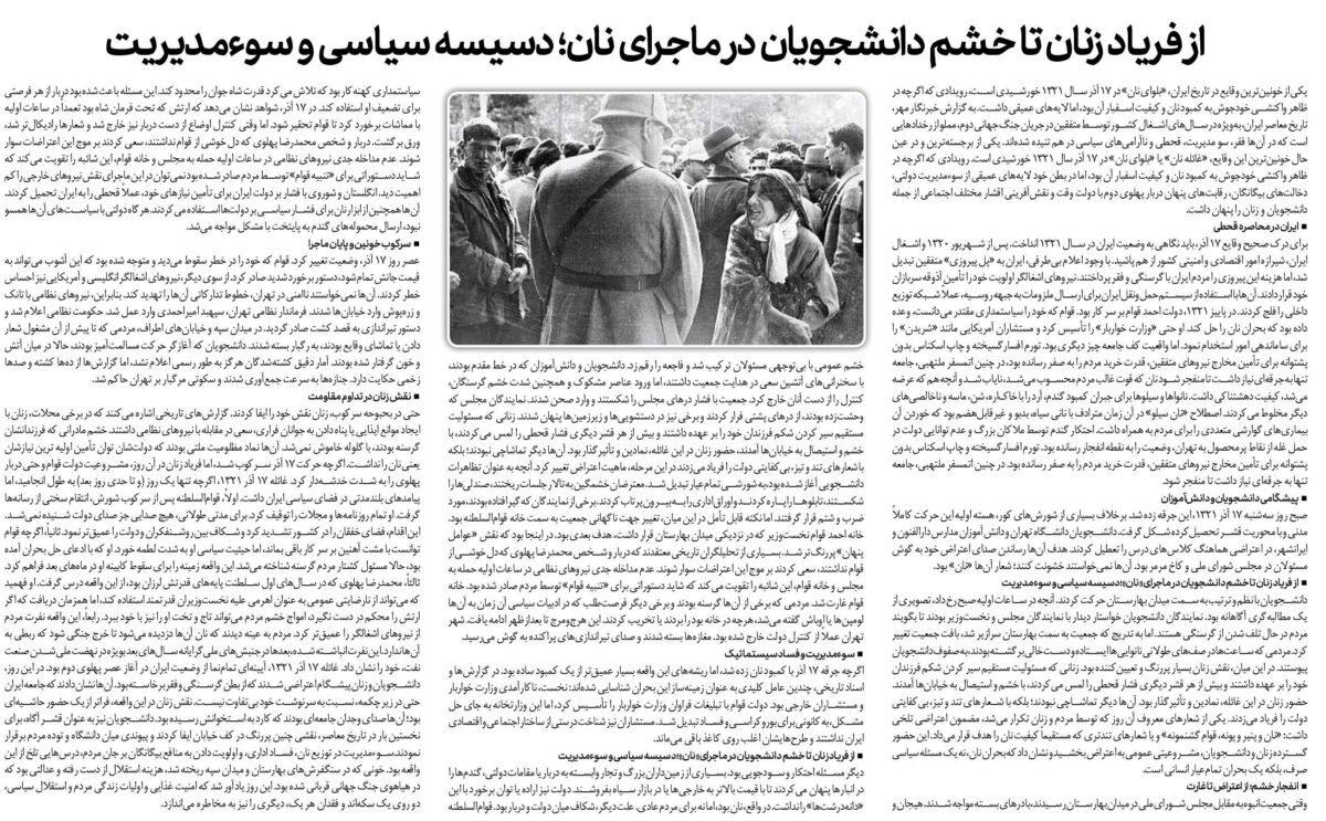 حتی در بحبوحه سرکوب، زنان نقش خود را ایفا کردند. گزارشهای تاریخی اشاره میکنند که در برخی محلات، زنان با ایجاد موانع ایذایی یا پناه دادن به جوانان فراری، سعی در مقابله با نیروهای نظامی داشتند. خشم مادرانی که فرزندانشان گرسنه بودند، با گلوله خاموش نمیشد. آنها نماد مظلومیت ملتی بودند که دولتشان توان تأمین اولیه ترین نیازشان یعنی نان را نداشت. اگرچه حرکت ۱۷ آذر سرکوب شد، اما فریاد زنان در آن روز، مشروعیت دولت قوام و حتی دربار پهلوی را به شدت خدشهدار کرد. غائله ۱۷ آذر ۱۳۲۱، اگرچه تنها یک روز (و تا حدی روز بعد) به طول انجامید، اما پیامدهای بلندمدتی در فضای سیاسی ایران داشت. اولاً، قوامالسلطنه پس از سرکوب شورش، انتقام سختی از رسانهها گرفت. او تمام روزنامهها و مجلات را توقیف کرد. برای مدتی طولانی، هیچ صدایی جز صدای دولت شنیده نمیشد. این اقدام، فضای خفقان را در کشور تشدید کرد و شکاف بین روشنفکران و دولت را عمیقتر نمود. ثانیاً، اگرچه قوام توانست با مشت آهنین بر سر کار باقی بماند، اما حیثیت سیاسی او به شدت لطمه خورد. او که با ادعای حل بحران آمده بود، حالا مسئول کشتار مردم گرسنه شناخته میشد. این واقعه زمینه را برای سقوط کابینه او در ماههای بعد فراهم کرد. ثالثاً، محمدرضا پهلوی که در سالهای اول سلطنت پایههای قدرتش لرزان بود، از این واقعه درس گرفت. او فهمید که میتواند از نارضایتی عمومی به عنوان اهرمی علیه نخستوزیران قدرتمند استفاده کند، اما همزمان دریافت که اگر ارتش را محکم در دست نگیرد، امواج خشم مردم میتواند تاج و تخت او را نیز با خود ببرد. رابعاً، این واقعه نفرت مردم از نیروهای اشغالگر را عمیقتر کرد. مردم به عینه دیدند که نان آنها دزدیده میشود تا خرج جنگی شود که ربطی به آنها ندارد. این نفرت انباشته شده، بعدها در جنبشهای ملیگرایانه سالهای بعد بویژه در نهضت ملی شدن صنعت نفت، خود را نشان داد. غائله ۱۷ آذر ۱۳۲۱، آیینهای تمامنما از وضعیت ایران در آغاز عصر پهلوی دوم بود. در این روز، دانشجویان و زنان پیشگام اعتراضی شدند که از بطن گرسنگی و فقر برخاسته بود. آنها نشان دادند که جامعه ایران حتی در زیر چکمه، نسبت به سرنوشت خود بیتفاوت نیست. نقش زنان در این واقعه، فراتر از یک حضور حاشیهای بود؛ آنها صدای وجدان جامعهای بودند که کارد به استخوانش رسیده بود. دانشجویان نیز به عنوان قشر آگاه، برای نخستین بار در تاریخ معاصر، نقشی چنین پررنگ در کف خیابان ایفا کردند و پیوندی میان دانشگاه و توده مردم برقرار نمودند.سوءمدیریت در توزیع نان، فساد اداری، و اولویت دادن به منافع بیگانگان بر جان مردم، درسهایی تلخ از این واقعه بود. خونی که در سنگفرشهای بهارستان و میدان سپه ریخته شد، هزینه استقلال از دست رفته و عدالتی بود که در هیاهوی جنگ جهانی قربانی شده بود. این روز یادآور شد که امنیت غذایی و اولیات زندگی مردم و استقلال سیاسی، دو روی یک سکهاند و فقدان هر یک، دیگری را نیز به مخاطره میاندازد.
