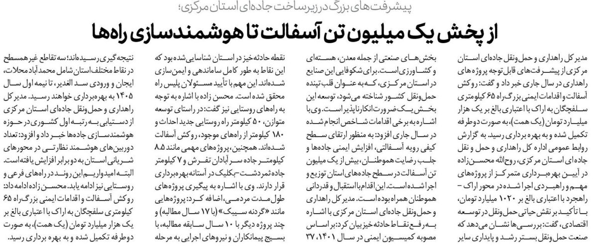 مدیرکل راهداری و حملونقل جادهای استان مرکزی از پیشرفتهای قابلتوجه پروژه های راهداری در سال جاری خبر داد و گفت: روکش آسفالت و اقدامات ایمنی بزرگراه ۶۵ کیلومتری سلفچگان به اراک با اعتباری بالغ بر یک هزار میلیارد تومان (یک همت)، به صورت دوطرفه تکمیل شده و به بهره برداری رسید. به گزارش روابط عمومی اداره کل راهداری و حمل و نقل جاده ای استان مرکزی، روحالله محسنزاده در آیین بهرهبرداری متمرکز از پروژههای مهم و راهبردی اجرا شده در محور اراک – راهجرد با اعتباری بالغ بر ۱۰۲۰ میلیارد تومان، با تأکید بر نقش حیاتی حملونقل در توسعه اقتصادی، گفت: بررسیها نشان میدهد که صنعت حملونقل بستر رشد و پایداری سایر بخشهای صنعتی از جمله معدن، هستهای و کشاورزی است. برای شکوفایی این صنایع در استان مرکزی، که به عنوان قلب تپنده حملونقل کشور شناخته میشود، توسعه این بخش یک ضرورت انکارناپذیر است. وی با اشاره به برخی اقدامات شاخص انجام شده در سال جاری افزود: به منظور ارتقای سطح کیفی رویه آسفالتی، افزایش ایمنی جادهها و جلب رضایت هموطنان، بیش از یک میلیون تن آسفالت در سطح جادههای استان توزیع و اجرا شده است. این اقدام با استقبال و قدردانی هموطنان همراه بوده است. مدیرکل راهداری و حملونقل جادهای استان مرکزی با اشاره به رفع نقاط حادثه خیز بیان کرد: بر اساس مصوبه کمیسیون ایمنی در سال ۱۴۰۱، ۳۷ نقطه حادثهخیز در استان شناساییشده بود که این نقاط به طور کامل ساماندهی و ایمنسازی شدهاند. این مهم با تأیید مسئولان پلیس راه محقق شده است. محسن زاده با اشاره به توجه به راههای روستایی نیز گفت: در راستای توسعه متوازن، ۵۰ کیلومتر راه روستایی جدید احداث و ۱۸۰ کیلومتر از راههای موجود، روکش آسفالت شدهاند. همچنین، پروژههای مهمی مانند ۸.۵ کیلومتر جاده سرآبادان تفرش و ۷ کیلومتر جاده ثمردشت-بکلیک در آستانه بهرهبرداری قرار دارند. وی با اشاره به پیگیری پروژههای طولمدت مردمی، اضافه کرد: پروژههایی مانند «گردنه سیبک» (با ۱۷ سال مطالبه) و چند پروژه دیگر با ۱۰ سال سابقه مطالبه، با بسیج پیمانکاران و نیروهای اجرایی به مرحله نتیجهگیری رسیدهاند؛ سه تقاطع غیرهمسطح در نقاط مختلف استان شامل محمدآباد محلات، ایجان و ورودی سد الغدیر، تا نیمه اول سال ۱۴۰۵ به بهرهبرداری خواهند رسید. مدیرکل راهداری و حملونقل جادهای استان مرکزی از دستیابی به رتبه اول کشوری در حوزه هوشمندسازی جادهها خبر داد و افزود: تعداد دوربینهای هوشمند نظارتی در محورهای شریانی استان به دو برابر افزایش یافته است. البته امیدواریم این روند در راههای فرعی و روستایی نیز ادامه یابد. محسن زاده ادامه داد: روکش آسفالت و اقدامات ایمنی بزرگراه ۶۵ کیلومتری سلفچگان به اراک با اعتباری بالغ بر یک هزار میلیارد تومان (یک همت)، به صورت دوطرفه تکمیل شده و به بهره برداری رسید.
