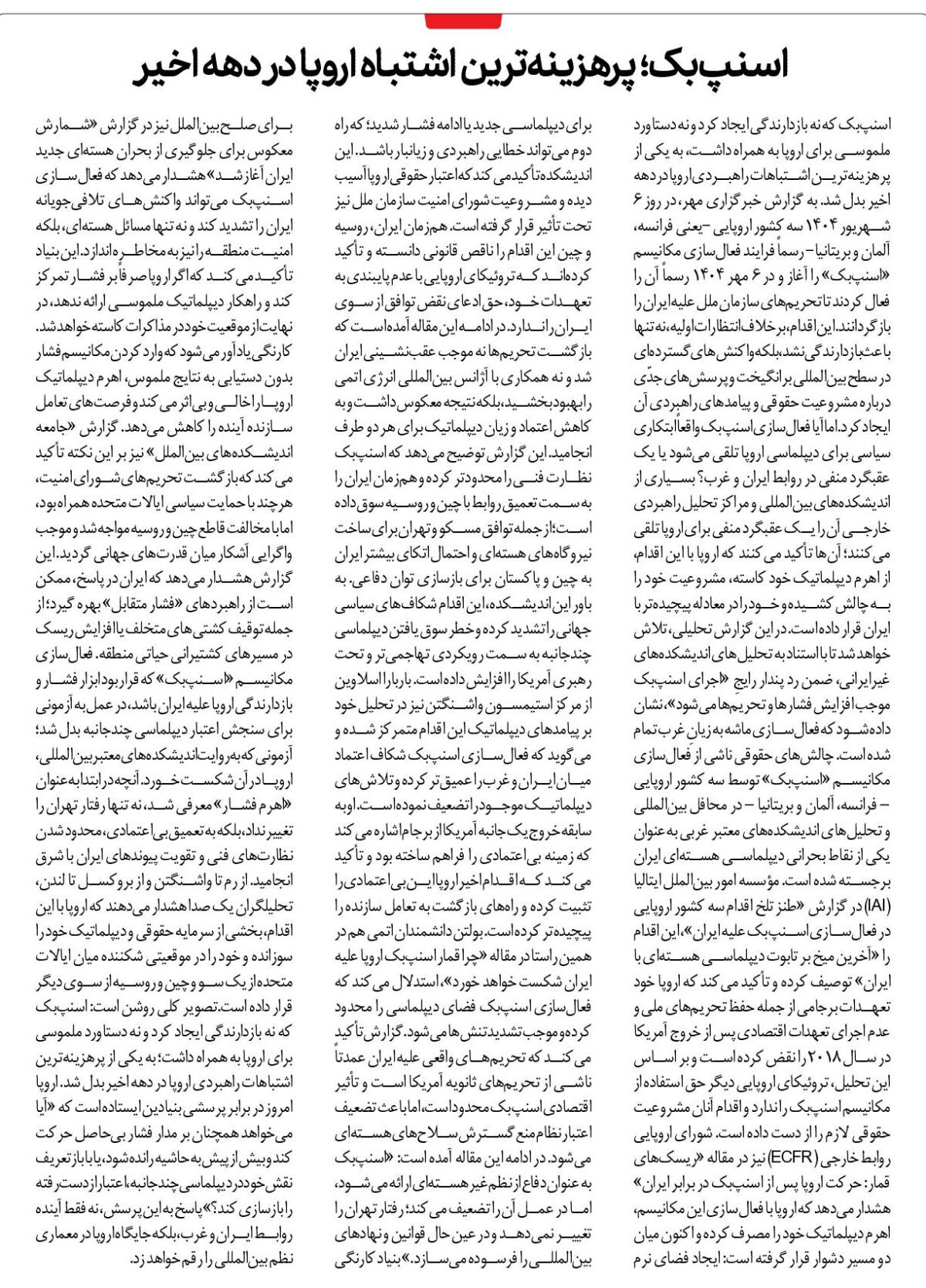 اسنپبک که نه بازدارندگی ایجاد کرد و نه دستاورد ملموسی برای اروپا به همراه داشت، به یکی از پرهزینهترین اشتباهات راهبردی اروپا در دهه اخیر بدل شد. به گزارش خبرگزاری مهر، در روز ۶ شهریور ۱۴۰۴ سه کشور اروپایی -یعنی فرانسه، آلمان و بریتانیا- رسماً فرایند فعالسازی مکانیسم «اسنپبک» را آغاز و در ۶ مهر ۱۴۰۴ رسماً آن را فعال کردند تا تحریمهای سازمان ملل علیه ایران را بازگردانند. این اقدام، برخلاف انتظارات اولیه، نهتنها باعث بازدارندگی نشد، بلکه واکنشهای گستردهای در سطح بینالمللی برانگیخت و پرسشهای جدّی درباره مشروعیت حقوقی و پیامدهای راهبردی آن ایجاد کرد. اما آیا فعالسازی اسنپبک واقعاً ابتکاری سیاسی برای دیپلماسی اروپا تلقی میشود یا یک عقبگرد منفی در روابط ایران و غرب؟ بسیاری از اندیشکدههای بینالمللی و مراکز تحلیل راهبردی خارجی آن را یک عقبگرد منفی برای اروپا تلقی میکنند؛ آنها تأکید میکنند که اروپا با این اقدام، از اهرم دیپلماتیک خود کاسته، مشروعیت خود را به چالش کشیده و خود را در معادله پیچیدهتر با ایران قرار داده است. در این گزارش تحلیلی، تلاش خواهد شد تا با استناد به تحلیلهای اندیشکدههای غیرایرانی، ضمن رد پندار رایجِ «اجرای اسنپبک موجب افزایش فشارها و تحریمها میشود»، نشان داده شود که فعالسازی ماشه به زیانِ غرب تمام شده است. چالشهای حقوقی ناشی از فعالسازی مکانیسم «اسنپبک» توسط سه کشور اروپایی – فرانسه، آلمان و بریتانیا – در محافل بینالمللی و تحلیلهای اندیشکدههای معتبر غربی بهعنوان یکی از نقاط بحرانی دیپلماسی هستهای ایران برجسته شده است. مؤسسه امور بینالملل ایتالیا (IAI) در گزارش «طنز تلخ اقدام سه کشور اروپایی در فعالسازی اسنپبک علیه ایران»، این اقدام را «آخرین میخ بر تابوت دیپلماسی هستهای با ایران» توصیف کرده و تأکید میکند که اروپا خود تعهدات برجامی از جمله حفظ تحریمهای ملی و عدم اجرای تعهدات اقتصادی پس از خروج آمریکا در سال ۲۰۱۸ را نقض کرده است و بر اساس این تحلیل، تروئیکای اروپایی دیگر حق استفاده از مکانیسم اسنپبک را ندارد و اقدام آنان مشروعیت حقوقی لازم را از دست داده است. شورای اروپایی روابط خارجی (ECFR) نیز در مقاله «ریسکهای قمار: حرکت اروپا پس از اسنپبک در برابر ایران» هشدار میدهد که اروپا با فعالسازی این مکانیسم، اهرم دیپلماتیک خود را مصرف کرده و اکنون میان دو مسیر دشوار قرار گرفته است: ایجاد فضای نرم برای دیپلماسی جدید یا ادامه فشار شدید؛ که راه دوم میتواند خطایی راهبردی و زیانبار باشد. این اندیشکده تأکید میکند که اعتبار حقوقی اروپا آسیب دیده و مشروعیت شورای امنیت سازمان ملل نیز تحت تأثیر قرار گرفته است. همزمان ایران، روسیه و چین این اقدام را ناقص قانونی دانسته و تأکید کردهاند که تروئیکای اروپایی با عدم پایبندی به تعهدات خود، حق ادعای نقض توافق از سوی ایران را ندارد. در ادامه این مقاله آمده است که بازگشت تحریمها نه موجب عقبنشینی ایران شد و نه همکاری با آژانس بینالمللی انرژی اتمی را بهبود بخشید، بلکه نتیجه معکوس داشت و به کاهش اعتماد و زیان دیپلماتیک برای هر دو طرف انجامید. این گزارش توضیح میدهد که اسنپبک نظارت فنی را محدودتر کرده و همزمان ایران را به سمت تعمیق روابط با چین و روسیه سوق داده است؛ از جمله توافق مسکو و تهران برای ساخت نیروگاههای هستهای و احتمال اتکای بیشتر ایران به چین و پاکستان برای بازسازی توان دفاعی. به باور این اندیشکده، این اقدام شکافهای سیاسی جهانی را تشدید کرده و خطر سوق یافتن دیپلماسی چندجانبه به سمت رویکردی تهاجمیتر و تحت رهبری آمریکا را افزایش داده است. باربارا اسلاوین از مرکز استیمسون واشنگتن نیز در تحلیل خود بر پیامدهای دیپلماتیک این اقدام متمرکز شده و میگوید که فعالسازی اسنپبک شکاف اعتماد میان ایران و غرب را عمیقتر کرده و تلاشهای دیپلماتیک موجود را تضعیف نموده است. او به سابقه خروج یکجانبه آمریکا از برجام اشاره میکند که زمینه بیاعتما