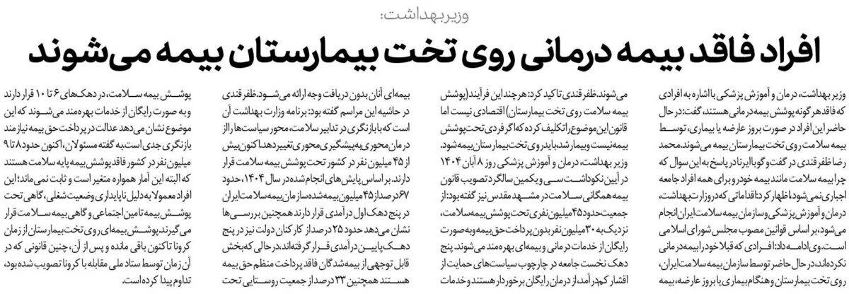 وزیر بهداشت، درمان و آموزش پزشکی با اشاره به افرادی که فاقد هرگونه پوشش بیمه درمانی هستند، گفت: در حال حاضر این افراد در صورت بروز عارضه یا بیماری، توسط بیمه سلامت روی تخت بیمارستان بیمه می‌شوند.محمد رضا ظفرقندی در گفت‌وگو با ایرنا در پاسخ به این سوال که چرا بیمه سلامت مانند بیمه خودرو برای همه افراد جامعه اجباری نمی‌شود، اظهار کرد: اقداماتی که در وزارت بهداشت، درمان و آموزش پزشکی و سازمان بیمه سلامت ایران انجام می‌شود، بر اساس قوانین مصوب مجلس شورای اسلامی است.وی ادامه داد: افرادی که قبلا خود را بیمه درمانی نکرده‌اند، در حال حاضر توسط سازمان بیمه سلامت ایران، روی تخت بیمارستان و هنگام بیماری یا بروز عارضه، بیمه می‌شوند.ظفرقندی تاکید کرد: هرچند این فرآیند (پوشش بیمه سلامت روی تخت بیمارستان) اقتصادی نیست اما قانون این موضوع را تکلیف کرده که اگر فردی تحت پوشش بیمه نیست و بیمار شد، باید روی تخت بیمارستان بیمه شود.وزیر بهداشت، درمان و آموزش پزشکی روز ۸ آبان ۱۴۰۴ در آیین نکوداشت سی و یکمین سالگرد تصویب قانون بیمه همگانی سلامت در مشهد مقدس نیز گفته بود: از جمعیت حدود ۴۵ میلیون نفری تحت پوشش بیمه سلامت، نزدیک به ۳۰ میلیون نفر بدون پرداخت حق بیمه و به‌صورت رایگان از خدمات درمانی و بیمه‌ای بهره‌مند می‌شوند. پنج دهک نخست جامعه در چارچوب سیاست‌های حمایت از اقشار کم‌درآمد، از درمان رایگان برخوردار هستند و خدمات بیمه‌ای آنان بدون دریافت وجه ارائه می‌شود.ظفرقندی در حاشیه این مراسم گفته بود: برنامه وزارت بهداشت آن است که با بازنگری در تدابیر سلامت، محور سیاست‌ها را از درمان‌محوری به پیشگیری‌ محوری تغییر دهد.اکنون بیش از ۴۵ میلیون نفر در کشور تحت پوشش بیمه سلامت قرار دارند. بر اساس پایش‌های انجام‌ شده در سال ۱۴۰۴، حدود ۶۷ درصد از ۴۵ میلیون بیمه‌شده سازمان بیمه سلامت ایران در پنج دهک اول درآمدی قرار دارند همچنین بررسی‌ها نشان می‌دهد حدود ۲۵ درصد از کارکنان دولت نیز در پنج دهک پایین درآمدی قرار گرفته‌اند، در حالی که بخش قابل توجهی از بیمه‌شدگان فاقد پرداخت منظم حق بیمه هستند همچنین ۳۳ درصد از جمعیت روستایی تحت پوشش بیمه سلامت، در دهک‌های ۶ تا ۱۰ قرار دارند و به‌ صورت رایگان از خدمات بهره‌مند می‌شوند که این موضوع نشان می‌دهد عدالت در پرداخت حق بیمه نیازمند بازنگری جدی است.به گفته مسئولان، اکنون حدود ۸ تا ۹ میلیون نفر در کشور فاقد پوشش بیمه پایه سلامت هستند که البته این آمار همواره متغیر است و ثابت نمی‌ماند؛ این افراد معمولا به دلیل ناپایداری وضعیت شغلی، گاهی تحت پوشش بیمه تامین اجتماعی و گاهی بیمه سلامت قرار می‌گیرند.پوشش بیمه‌ای روی تخت بیمارستان از زمان کرونا تاکنون باقی مانده و پس از آن، چنین قانونی که در آن زمان توسط ستاد ملی مقابله با کرونا تصویب شده بود، تداوم پیدا کرده است.