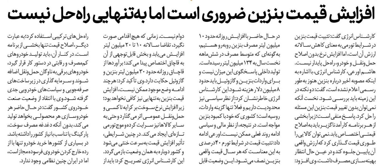 کارشناس انرژی گفت: تثبیت قیمت بنزین در شرایط تورمی به معنای کاهش سالانه ارزش آن است، اما افزایش نرخ بدون اصلاح حملونقل و خودرو، راهحل پایدار نیست.هاشم اورعی، کارشناس انرژی، با اشاره به اینکه مصوبه اخیر درباره بنزین هنوز بهطور رسمی اعلام نشده است، گفت: دو نکته در این زمینه باید بررسی شود. نخست آنکه نمیتوان بدون تغییر قیمت بنزین این مسئله را حل کرد. پاسخ منفی است؛ زیرا بخشی از هر برنامه کارآمد ناگزیر باید به اصلاح قیمتی اختصاص یابد. نمیتوان کالایی را طوری قیمتگذاری کرد که ارزش واقعی آن پایین جلوه کند و در عین حال انتظار بهینهسازی مصرف داشت.وی افزود: در حال حاضر با افزایش روزانه حدود ۱۰ میلیون لیتر مصرف بنزین روبهرو هستیم، بهگونهای که متوسط مصرف در ششماهه نخست سال به ۱۳۴ میلیون لیتر رسیده است. تولید داخلی پاسخگوی این میزان نیست و برای واردات بنزین و گازوئیل باید حدود ۸ میلیون دلار هزینه شود.این کارشناس انرژی خاطرنشان کرد: از نظر سیاسی نیز محدودیت داریم و فعلاً تنها گزینه واردات، روسیه است؛ کشوری که خود با کمبود بنزین مواجه است. در نتیجه، از نظر مالی و سیاسی ادامه روند فعلی ممکن نیست.اورعی ادامه داد: تثبیت قیمت در شرایط تورم ۴۰ درصدی به این معناست که هر سال قیمت واقعی بنزین نصف میشود. این وضعیت قابل دوام نیست. زمانی که هیچ اقدامی صورت نگیرد، تقاضا سالانه ۱۰ تا ۲۰ میلیون لیتر افزایش مییابد و بخش قابلتوجهی از آن به قاچاق اختصاص پیدا میکند؛ برآوردها از قاچاق روزانه حدود ۳۰ میلیون لیتر بنزین و گازوئیل حکایت دارد.وی تأکید کرد: هرچند ادامه وضع موجود ممکن نیست، افزایش قیمت بنزین بهتنهایی نیز کافی نخواهد بود؛ زیرا افزایش نرخ سوخت بر کرایه تاکسی و حملونقل عمومی اثر میگذارد و حتی به سایر کالاها نیز سرایت کرده و موج تورمی تازهای ایجاد میکند. در چنین شرایطی، تأثیر افزایش قیمت بهسرعت خنثی میشود و کشور دوباره به همان وضعیت بازمیگردد.این کارشناس انرژی تصریح کرد: باید از راهحلهای ترکیبی استفاده کرد؛ به عبارت دیگر، اصلاح قیمت تنها بخشی از برنامه است. در کنار آن، باید تولید خودروهای کممصرف و رقابتی در دستور کار قرار گیرد، خودروهای برقی به ناوگان حملونقل اضافه شوند و سرمایهگذاری در زیرساختهای صرفهجویی و سیاستهای خودرویی جدی گرفته شود.وی با انتقاد از وضعیت صنعت خودروی کشور گفت: در حال حاضر هر خودروسازی هر محصولی بخواهد تولید میکند، بدون آنکه دغدغه مصرف سوخت، پارکینگ یا تناسب با نیاز کشور را داشته باشد. در بسیاری از کشورها خرید خودرو تنها با از رده خارج کردن خودروی فرسوده مجاز است، اما در ایران چنین نظامی وجود ندارد.