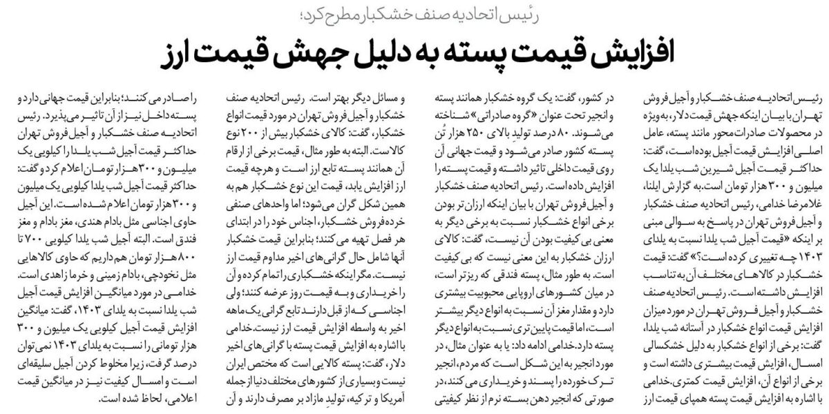 رئیس اتحادیه صنف خشکبار و آجیلفروش تهران با بیان اینکه جهش قیمت دلار، بهویژه در محصولات صادراتمحور مانند پسته، عامل اصلی افزایش قیمت آجیل بوده است، گفت: حداکثر قیمت آجیل شیرین شب یلدا یک میلیون و ۳۰۰ هزار تومان است.به گزارش ایلنا، غلامرضا خدامی، رئیس اتحادیه صنف خشکبار و آجیلفروش تهران در پاسخ به سوالی مبنی بر اینکه «قیمت آجیل شب یلدا نسبت به یلدای ۱۴۰۳ چه تغییری کرده است؟» گفت: قیمت خشکبار در کالاهای مختلف آن به تناسب افزایش داشته است. رئیس اتحادیه صنف خشکبار و آجیلفروش تهران در مورد میزان افزایش قیمت انواع خشکبار در آستانه شب یلدا، گفت: برخی از انواع خشکبار به دلیل خشکسالی امسال، افزایش قیمت بیشتری داشته است و برخی از انواع آن، افزایش قیمت کمتری.خدامی با اشاره به افزایش قیمت پسته همپای قیمت ارز در کشور، گفت: یک گروه خشکبار همانند پسته و انجیر تحت عنوان «گروه صادراتی» شناخته میشوند. ۸۰ درصد تولیدِ بالای ۲۵۰ هزار تُن پسته کشور صادر میشود و قیمت جهانی آن روی قیمت داخلی تاثیر داشته و قیمت پسته را افزایش داده است. رئیس اتحادیه صنف خشکبار و آجیلفروش تهران با بیان اینکه ارزانتر بودن برخی انواع خشکبار نسبت به برخی دیگر به معنی بیکیفیت بودن آن نیست، گفت: کالای ارزان خشکبار به این معنی نیست که بیکیفیت است. به طور مثال، پسته فندقی که ریزتر است، در میان کشورهای اروپایی محبوبیت بیشتری دارد و مقدار مغز آن نسبت به انواع دیگر بیشتر است، اما قیمت پایینتری نسبت به انواع دیگر پسته دارد.خدامی ادامه داد: یا به عنوان مثال، در مورد انجیر به این شکل است که مردم، انجیر ترک خورده را پسند و خریداری میکنند، در صورتی که انجیر دهن بسته نرم از نظر کیفیتی و مسائل دیگر بهتر است. رئیس اتحادیه صنف خشکبار و آجیلفروش تهران در مورد قیمت انواع خشکبار، گفت: کالای خشکبار بیش از ۲۰۰ نوع کالاست. البته به طور مثال، قیمت برخی از ارقام آن همانند پسته تابع ارز است و هرچه قیمت ارز افزایش یابد، قیمت این نوع خشکبار هم به همین شکل گران میشود؛ اما واحدهای صنفی خردهفروش خشکبار، اجناس خود را در ابتدای هر فصل تهیه میکنند؛ بنابراین قیمت خشکبار آنها شامل حال گرانیهای اخیر مداوم قیمت ارز نیست. مگر اینکه خشکباری را تمام کرده و آن را خریداری و به قیمت روز عرضه کنند؛ ولی اجناسی که از قبل دارند تابع گرانی یک ماهه اخیر به واسطه افزایش قیمت ارز نیست.خدامی با اشاره به افزایش قیمت پسته با گرانیهای اخیر دلار، گفت: پسته کالایی است که مختص ایران نیست و بسیاری از کشورهای مختلف دنیا ازجمله آمریکا و ترکیه، تولیدِ مازاد بر مصرف دارند و آن را صادر میکنند؛ بنابراین قیمت جهانی دارد و پسته داخل نیز از آن تاثیر میپذیرد. رئیس اتحادیه صنف خشکبار و آجیلفروش تهران حداکثر قیمت آجیل شب یلدا را کیلویی یک میلیون و ۳۰۰ هزار تومان اعلام کرد و گفت: حداکثر قیمت آجیل شب یلدا کیلویی یک میلیون و ۳۰۰ هزار تومان اعلام شده است. این آجیل حاوی اجناسی مثل بادام هندی، مغز بادام و مغز فندق است. البته آجیل شب یلدا کیلویی ۷۰۰ تا ۸۰۰ هزار تومان هم داریم که حاوی کالاهایی مثل نخودچی، بادام زمینی و خرما زاهدی است.خدامی در مورد میانگین افزایش قیمت آجیل شب یلدا نسبت به یلدای ۱۴۰۳، گفت: میانگین افزایش قیمت آجیل کیلویی یک میلیون و ۳۰۰ هزار تومانی را نسبت به یلدای ۱۴۰۳ نمیتوان درصد گرفت، زیرا مخلوط کردن آجیل سلیقهای است و امسال کیفیت نیز در میانگین قیمت اعلامی، لحاظ شده است.