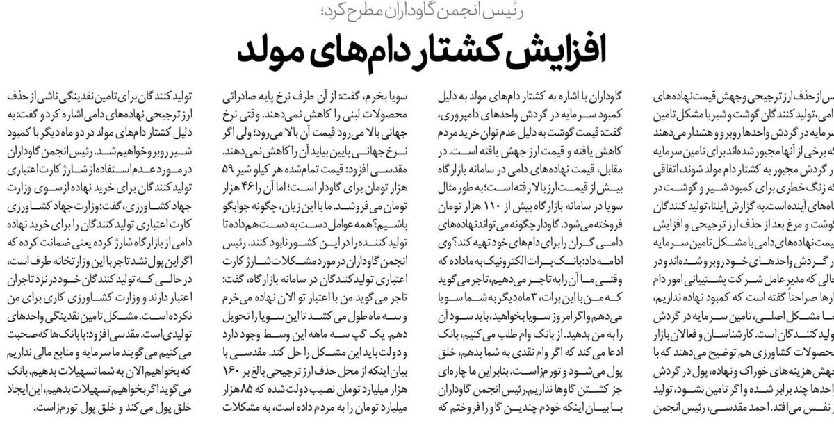 پس از حذف ارز ترجیحی و جهش قیمت نهادههای دامی، تولیدکنندگان گوشت و شیر با مشکل تامین سرمایه در گردش واحدها روبرو و هشدار میدهند که برخی از آنها مجبور شدهاند برای تامین سرمایه در گردش مجبور به کشتار دام مولد شوند، اتفاقی که زنگ خطری برای کمبود شیر و گوشت در ماههای آینده است.به گزارش ایلنا، تولیدکنندگان گوشت و مرغ بعد از حذف ارز ترجیحی و افزایش قیمت نهادههای دامی با مشکل تامین سرمایه در گردش واحدهای خود روبرو شدهاند و در حالی که مدیرعامل شرکت پشتیبانی امور دام بارها صراحتاً گفته است که کمبود نهاده نداریم، اما مشکل اصلی، تامین سرمایه در گردش تولیدکنندگان است.کارشناسان و فعالان بازار محصولات کشاورزی هم توضیح میدهند که با جهش هزینههای خوراک و نهاده، پول در گردش واحدها چند برابر شده و اگر تامین نشود، تولید از نفس میافتد. احمد مقدسی، رئیس انجمن گاوداران با اشاره به کشتار دامهای مولد به دلیل کمبود سرمایه در گردش واحدهای دامپروری، گفت: قیمت گوشت به دلیل عدم توان خرید مردم کاهش یافته و قیمت ارز جهش یافته است. در مقابل، قیمت نهادههای دامی در سامانه بازارگاه بیش از قیمت ارز بالا رفته است؛ به طور مثال سویا در سامانه بازارگاه بیش از ۱۱۰ هزار تومان فروخته میشود. گاودار چگونه میتواند نهادههای دامی گران را برای دامهای خود تهیه کند؟ وی ادامه داد: بانک برات الکترونیک به ما داده که وقتی ما آن را به تاجر میدهیم، تاجر میگوید که من با این برات، ۳ ماه دیگر به شما سویا میدهم و اگر امروز سویا بخواهید، باید سود آن را به من بدهید. از بانک وام طلب میکنیم، بانک ادعا میکند که اگر وام نقدی به شما بدهم، خلق پول میشود و تورمزاست. بنابراین ما چارهای جز کشتن گاوها نداریم.رئیس انجمن گاوداران با بیان اینکه خودم چندین گاو را فروختم که سویا بخرم، گفت: از آن طرف نرخ پایه صادراتی محصولات لبنی را کاهش نمیدهند. وقتی نرخ جهانی بالا میرود قیمت آن بالا میرود؛ ولی اگر نرخ جهانی پایین بیاید آن را کاهش نمیدهند. مقدسی افزود: قیمت تمامشده هر کیلو شیر ۵۹ هزار تومان برای گاودار است؛ اما آن را ۴۶ هزار تومان میفروشد. ما با این زیان، چگونه جوابگو باشیم؟ همه عوامل دست به دست هم داده تا تولیدکننده را در این کشور نابود کنند. رئیس انجمن گاوداران در مورد مشکلات شارژ کارت اعتباری تولیدکنندگان در سامانه بازارگاه، گفت: تاجر میگوید من با اعتبار تو الان نهاده میخرم و سه ماه طول میکشد تا این سویا را تحویل دهم. یک گپ سه ماهه این وسط وجود دارد و دولت باید این مشکل را حل کند. مقدسی با بیان اینکه از محل حذف ارز ترجیحی بالغ بر ۱۶۰ هزار میلیارد تومان نصیب دولت شده که ۸۵ هزار میلیارد تومان را به مردم داده است، به مشکلات تولیدکنندگان برای تامین نقدینگی ناشی از حذف ارز ترجیحی نهادههای دامی اشاره کرد و گفت: به دلیل کشتار دامهای مولد در دو ماه دیگر با کمبود شیر روبرو خواهیم شد. رئیس انجمن گاوداران در مورد عدم استفاده از شارژ کارت اعتباری تولیدکنندگان برای خرید نهاده ازسوی وزارت جهاد کشاورزی، گفت: وزارت جهاد کشاورزی کارت اعتباری تولیدکنندگان را برای خرید نهاده دامی از بازارگاه شارژ کرده یعنی ضمانت کرده که اگر این پول نشد تاجر با این وزارتخانه طرف است، در حالی که تولیدکنندگان خود در نزد تاجران اعتبار دارند و وزارت کشاورزی کاری برای من نکرده است. مشکل تامین نقدینگی واحدهای تولیدی است. مقدسی افزود: با بانکها که صحبت میکنیم میگویند ما سرمایه و منابع مالی نداریم که بخواهیم الان به شما تسهیلات بدهیم. بانک میگوید اگر بخواهیم تسهیلات بدهیم، این ایجاد خلق پول میکند و خلق پول تورمزاست.