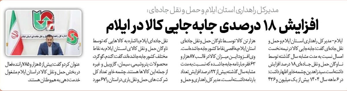 ایلام- مدیرکل راهداری استان ایلام و حمل و نقل جادهای گفت: جابهجایی کالا در نیمه نخست امسال نسبت به مدت مشابه سال گذشته توسط ناوگان حمل و نقل جادهای ۱۸ درصد افزایش داشته است. سیدزاهدین چشمهخاور اظهار داشت: در ۶ ماهه سال ۱۴۰۴ بیش از یک میلیون و ۴۳۶ هزار تن کالا توسط ناوگان حمل و نقل جادهای استان ایلام به اقصی نقاط کشور جابهجا شده است. وی افزود: این میزان کالا در قالب ۸۷ هزار و ۶۳ فقره بارنامه جابهجا شده که نسبت به مدت مشابه سال گذشته بیش از ۲۲ درصد افزایش تعداد بارنامه داشته است. مدیرکل راهداری و حمل و نقل جاده ای ایلام با اشاره به کالاهایی که توسط ناوگان حمل و نقل کالای استان ایلام به نقاط مختلف کشور جابهجا شده اند، گفت: گندم، گوگرد، محصولات پتروشیمی، سیمان، گازوییل و غیره از جمله این کالاها هستند. چشمه خاور تعداد کل شرکت های حمل و نقل باری در استان را ۶۷ مورد عنوان کرد و گفت: بیش از ۵ هزار و ۷۸۵ راننده فعال در بخش حمل و نقل کالا در استان ایلام مشغول خدمت دهی به هموطنان هستند.