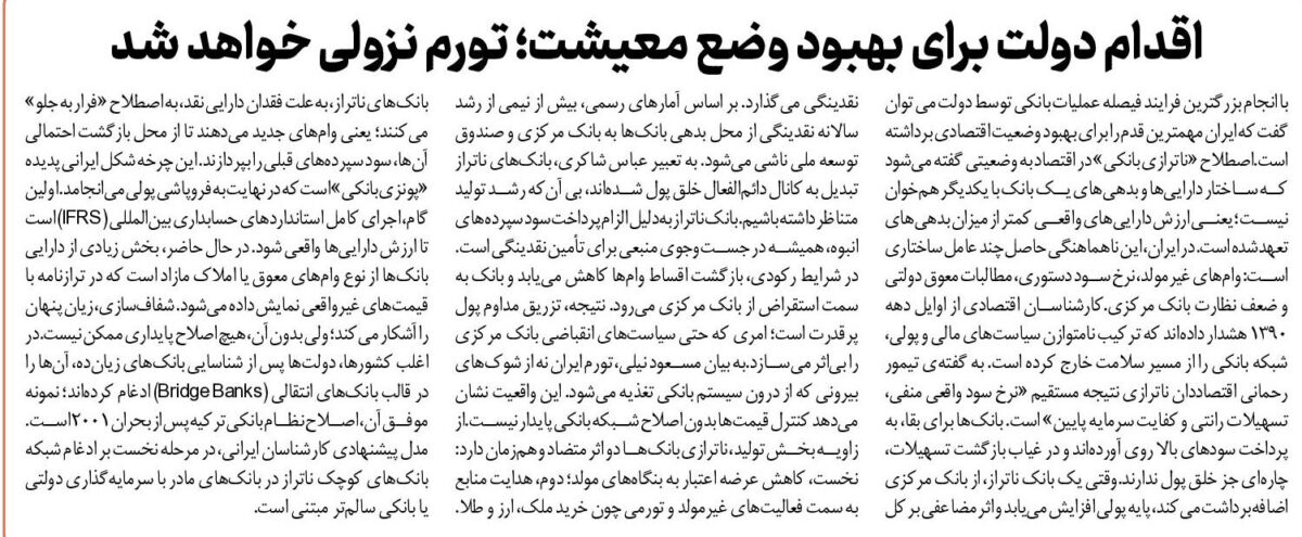 با انجام بزرگترین فرایند فیصله عملیات بانکی توسط دولت می توان گفت که ایران مهمترین قدم را برای بهبود وضعیت اقتصادی برداشته است.اصطلاح «ناترازی بانکی» در اقتصاد به وضعیتی گفته میشود که ساختار داراییها و بدهیهای یک بانک با یکدیگر همخوان نیست؛ یعنی ارزش داراییهای واقعی کمتر از میزان بدهیهای تعهدشده است. در ایران، این ناهماهنگی حاصل چند عامل ساختاری است: وامهای غیرمولد، نرخ سود دستوری، مطالبات معوق دولتی و ضعف نظارت بانک مرکزی.کارشناسان اقتصادی از اوایل دهه ۱۳۹۰ هشدار دادهاند که ترکیب نامتوازن سیاستهای مالی و پولی، شبکه بانکی را از مسیر سلامت خارج کرده است. به گفتهی تیمور رحمانی اقتصاددان ناترازی نتیجه مستقیم «نرخ سود واقعی منفی، تسهیلات رانتی و کفایت سرمایه پایین» است. بانکها برای بقا، به پرداخت سودهای بالا روی آوردهاند و در غیاب بازگشت تسهیلات، چارهای جز خلق پول ندارند.وقتی یک بانک ناتراز، از بانک مرکزی اضافهبرداشت میکند، پایه پولی افزایش مییابد و اثر مضاعفی بر کل نقدینگی میگذارد. بر اساس آمارهای رسمی، بیش از نیمی از رشد سالانه نقدینگی از محل بدهی بانکها به بانک مرکزی و صندوق توسعه ملی ناشی میشود. به تعبیر عباس شاکری، بانکهای ناتراز تبدیل به کانال دائمالفعال خلق پول شدهاند، بی آنکه رشد تولید متناظر داشته باشیم. بانک ناتراز بهدلیل الزام پرداخت سود سپردههای انبوه، همیشه در جستوجوی منبعی برای تأمین نقدینگی است. در شرایط رکودی، بازگشت اقساط وامها کاهش مییابد و بانک به سمت استقراض از بانک مرکزی میرود. نتیجه، تزریق مداوم پول پرقدرت است؛ امری که حتی سیاستهای انقباضی بانک مرکزی را بیاثر میسازد.به بیان مسعود نیلی، تورم ایران نه از شوکهای بیرونی که از درون سیستم بانکی تغذیه میشود. این واقعیت نشان میدهد کنترل قیمتها بدون اصلاح شبکه بانکی پایدار نیست.از زاویه بخش تولید، ناترازی بانکها دو اثر متضاد و همزمان دارد: نخست، کاهش عرضه اعتبار به بنگاههای مولد؛ دوم، هدایت منابع به سمت فعالیتهای غیرمولد و تورمی چون خرید ملک، ارز و طلا.بانکهای ناتراز، بهعلت فقدان دارایی نقد، به اصطلاح «فرار به جلو» میکنند؛ یعنی وامهای جدید میدهند تا از محل بازگشت احتمالی آنها، سود سپردههای قبلی را بپردازند. این چرخه شکل ایرانی پدیده «پونزی بانکی» است که در نهایت به فروپاشی پولی میانجامد. اولین گام، اجرای کامل استانداردهای حسابداری بینالمللی (IFRS) است تا ارزش داراییها واقعی شود. در حال حاضر، بخش زیادی از دارایی بانکها از نوع وامهای معوق یا املاک مازاد است که در ترازنامه با قیمتهای غیرواقعی نمایش داده میشود. شفافسازی، زیان پنهان را آشکار میکند؛ ولی بدون آن، هیچ اصلاح پایداری ممکن نیست.در اغلب کشورها، دولتها پس از شناسایی بانکهای زیانده، آنها را در قالب بانکهای انتقالی (Bridge Banks) ادغام کردهاند؛ نمونه موفق آن، اصلاح نظام بانکی ترکیه پس از بحران ۲۰۰۱ است. مدل پیشنهادی کارشناسان ایرانی، در مرحله نخست بر ادغام شبکه بانکهای کوچک ناتراز در بانکهای مادر با سرمایهگذاری دولتی یا بانکی سالمتر مبتنی است.