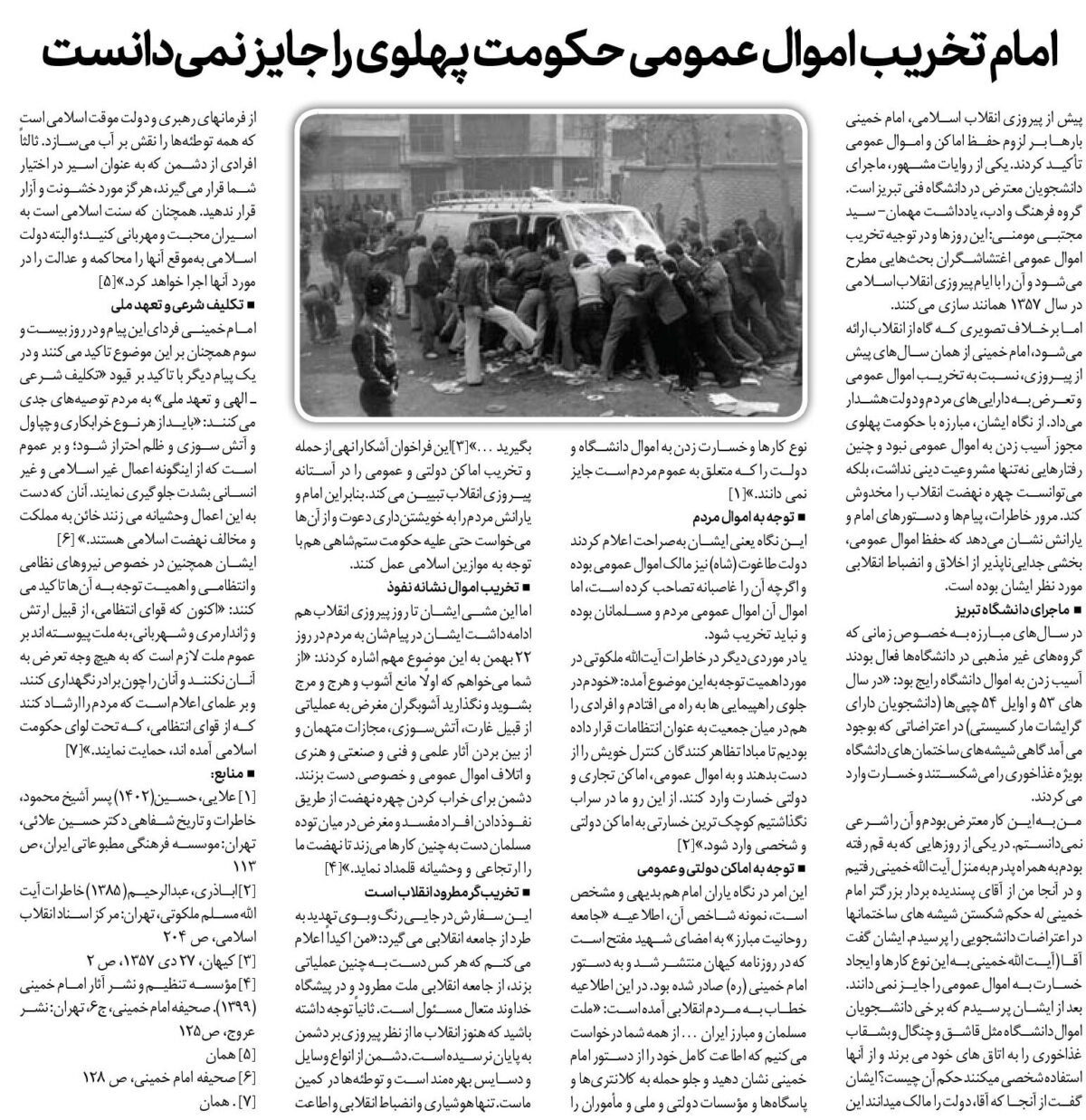 پیش از پیروزی انقلاب اسلامی، امام خمینی بارها بر لزوم حفظ اماکن و اموال عمومی تأکید کردند. یکی از روایات مشهور، ماجرای دانشجویان معترض در دانشگاه فنی تبریز است. گروه فرهنگ و ادب، یادداشت مهمان- سید مجتبی مومنی: این روزها و در توجیه تخریب اموال عمومی اغتشاشگران بحثهایی مطرح میشود و آن را با ایام پیروزی انقلاب اسلامی در سال ۱۳۵۷ همانند سازی میکنند.