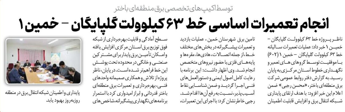 ناظر پروژه خط ۶۳ کیلوولت گلپایگان – خمین ۱ خبر داد: عملیات تعمیرات سالیانه خط ۶۳ کیلوولت گلپایگان – خمین ۱ (۶۰۲) با موفقیت توسط گرو های های تعمیر و نگهداری خطوط استان مرکزی به پایان رسید. به گزارش دفتر روابط عمومی شرکت برق منطقهای باختر، «محسن رجبی» ضمن اعلام این خبر افزود: با هدف ارتقای پایداری شبکه انتقال برق و افزایش قابلیت اطمینان تامین برق شهرستان خمین ، عملیات بازدید و تعمیرات پیشگیرانه در بخشهای مختلف خط، از جمله اتصالات، هادیها، مقرهها و پایههای فلزی با حضور نیروهای متخصص انجام شد. وی اظهار داشت: این برنامه با رعایت کامل اصول ایمنی و دستورالعملهای فنی اجرا گردید و ضمن شناسایی نقاط آسیبپذیر، نسبت به رفع آنها اقدام شد. رجبی خاطرنشان کرد: با اجرای این تعمیرات، سطح آمادگی و قابلیت بهرهبرداری از شبکه فوق توزیع برق استان مرکزی افزایش یافته و امکان تأمین برق پایدار برای مشترکین صنعتی و خانگی در محدوده تحت پوشش این خط فراهمتر شده است. در پایان، ناظر پروژه از تلاش و همکاری صمیمانه واحدهای فنی، بهرهبرداری و تعمیرات برق منطقهای باختر قدردانی و ابراز امیدواری کرد با استمرار برنامههای نگهداری پیشگیرانه، شاخصهای پایداری و اطمینان شبکه انتقال برق در منطقه روزبهروز بهبود یابد.